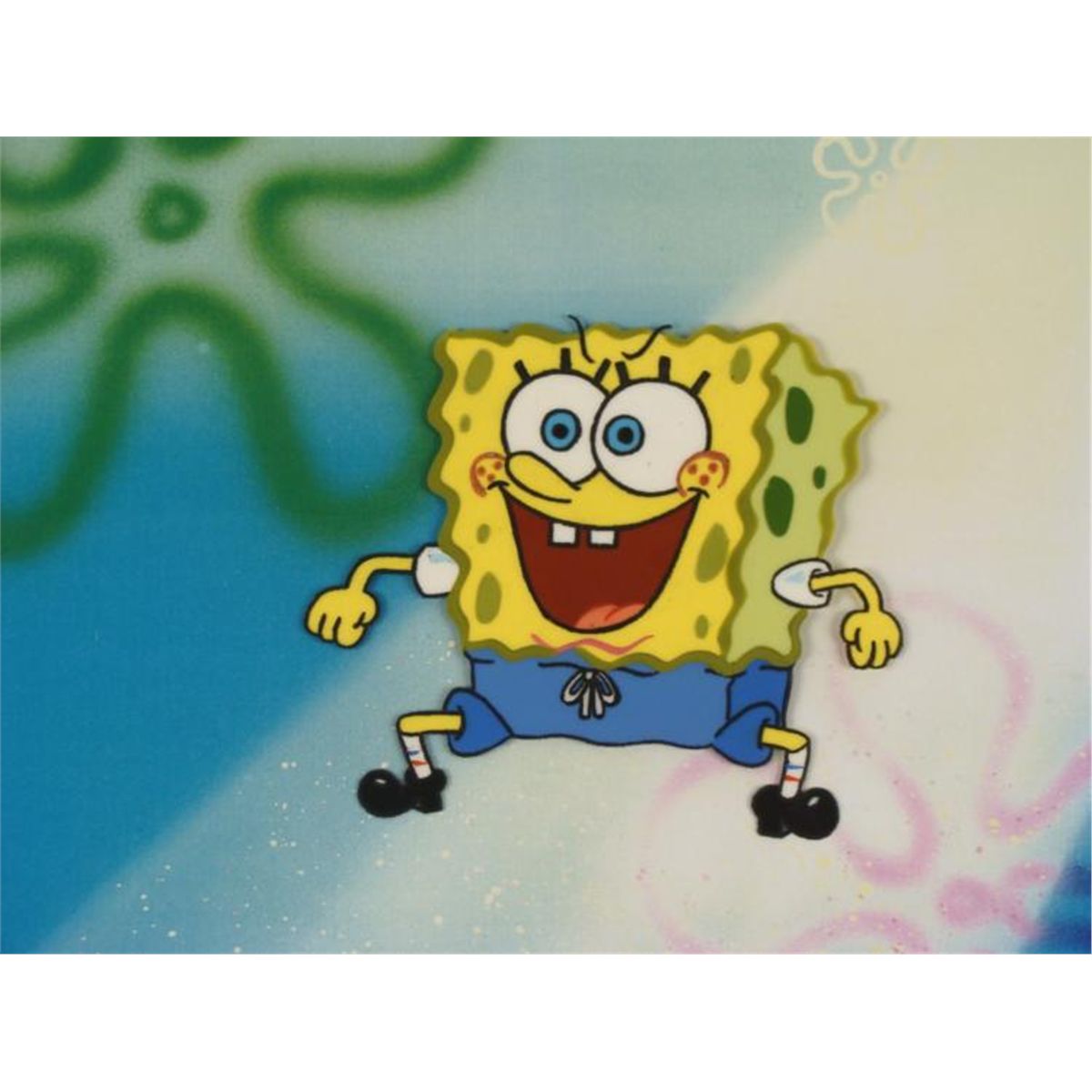 This original hand-painted cel with reproduction background is from the Nickelodeon TV show SpongeBob Squarepants. The story takes place under the deep blue sea in Bikini Bottom, where SpongeBob resides. SpongeBob, who is a yellow, porous sponge, is your typical happy-go-lucky character, as he is always cheerful and enjoys making people laugh. Patrick Star, SpongeBob's neighbor who is a starfish, boasts knowing nothing and is often getting himself into ridiculous situations. Between the homes of these two lies the home of the miserable Squidward, a squid, who is known for being grouchy and playing tricks on SpongeBob and Patrick. Both SpongeBob and Squidward work at the Krusty Krab, a fast food business run by the greedy money-loving Mr. Krabs, a crab, the arch rival of the evil, possibly misunderstood, Plankton. Another neighbor, Sandy Cheeks, an athletic squirrel who normally wears an astronaut's space suit, was introduced in "Tea at the Treedome." She spends most of her time inventing and experimenting. SpongeBob is jumping into the spotlight! * * Overall Size of Background: 11" x 17" Overall size of cel: 10 1/2" x 12 1/2"Very good conditionOriginal Production Backgrounds are used in the making of the final version of animated productions. The background establishes the location and the overall good mood of the scene. Typically, a background layout artist creates a drawing to establish the content of the scene, placement of characters, perspective and camera angle. Based on this drawing, the background artist creates a preliminary painting to confirm all of the scenes details, then the final production background which is used in the filming of the scene. When these backgrounds are individually photographed behind the progression of production cels, and projected at a rapid succession, the images in the foreground appear to move, creating an animated scene. * This cel was placed with this background because it appears to go well with it. The bottom of the sheet has peg holes, and the animator's notations. *
