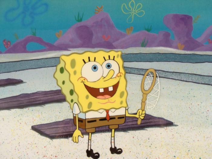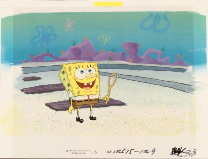 This animation cel and reproduction background are from the Nickelodeon TV show SpongeBob Squarepants. The story takes place under the deep blue sea in Bikini Bottom, where SpongeBob resides. SpongeBob, who is a yellow, porous sponge, is your typical happy-go-lucky character, as he is always cheerful and enjoys making people laugh. Patrick Star, SpongeBob's neighbor who is a starfish, is your average children's show idiot, as he boasts knowing nothing and is often getting himself into ridiculous situations. Between the homes of these two lies the home of the miserable Squidward, a squid, who is known for being grouchy and playing tricks on SpongeBob and Patrick. Both SpongeBob and Squidward work at the Krusty Krab, a fast food business run by the greedy money-loving Mr. Krabs, a crab, the arch rival of the evil, possibly misunderstood, Plankton. Another neighbor, Sandy Cheeks, an athletic squirrel who normally wears an astronaut's space suit, was introduced in "Tea at the Treedome." She spends most of her time inventing and experimenting. SpongeBob is happy to go jelly fishing.Original Printed Background and Animated Cel Overall Size of Background: 11" x 17" Overall Size of the Cel: 10 1/2" x 12 1/2" Very good condition This is an original hand-painted cel set-up used in the production of an episode of "SpongeBob SquarePants." Each one-of-a-kind set-up represents a slight change in position of the characters. When individually photographed and projected in rapid succession, the images appear to move.