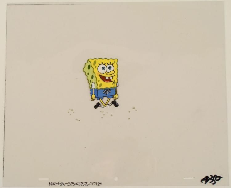 This original animation cel is from the Nickelodeon TV show SpongeBob Squarepants. The story takes place under the deep blue sea in Bikini Bottom, where SpongeBob resides. SpongeBob, who is a yellow, porous sponge, is your typical happy-go-lucky character, as he is always cheerful and enjoys making people laugh. Patrick Star, SpongeBob's neighbor who is a starfish, boasts knowing nothing and is often getting himself into ridiculous situations. Between the homes of these two lies the home of the miserable Squidward, a squid, who is known for being grouchy and playing tricks on SpongeBob and Patrick. Both SpongeBob and Squidward work at the Krusty Krab, a fast food business run by the greedy money-loving Mr. Krabs, a crab, the arch rival of the evil, possibly misunderstood, Plankton. Another neighbor, Sandy Cheeks, an athletic squirrel who normally wears an astronaut's space suit, was introduced in "Tea at the Treedome." She spends most of her time inventing and experimenting. * Squidward looks like he's singing "Skip To My Lou" as he skips along here. * * Original Production Animated Cel Overall Size of Cel: 10 1/2" x 12 1/2" Very Good ConditionThis is an original hand-painted cel set-up used in the production of an episode of "SpongeBob SquarePants." Each one-of-a-kind set-up represents a slight change in position of the characters. When individually photographed and projected in rapid succession, the images appear to move. * To create production cels, the original animator's drawing is transferred onto an acetate cel (by hand-inking and/or photo copying). The cel is then hand-painted on the reverse side. * The animator's notations are at the bottom of the cel. * This is a double layer cel, with some gravel on the ground on a separate sheet.