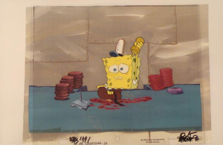 This animation cel and reproduction background are from the Nickelodeon TV show SpongeBob Squarepants. The story takes place under the deep blue sea in Bikini Bottom, where SpongeBob resides. SpongeBob, who is a yellow, porous sponge, is your typical happy-go-lucky character, as he is always cheerful and enjoys making people laugh. Patrick Star, SpongeBob's neighbor who is a starfish, is your average children's show idiot, as he boasts knowing nothing and is often getting himself into ridiculous situations. Between the homes of these two lies the home of the miserable Squidward, a squid, who is known for being grouchy and playing tricks on SpongeBob and Patrick. Both SpongeBob and Squidward work at the Krusty Krab, a fast food business run by the greedy money-loving Mr. Krabs, a crab, the arch rival of the evil, possibly misunderstood, Plankton. Another neighbor, Sandy Cheeks, an athletic squirrel who normally wears an astronaut's space suit, was introduced in "Tea at the Treedome." She spends most of her time inventing and experimenting. * Mustard goes in the shoe * Original Printed Background and Animated Cel Overall Size of Background: 11" x 17" Overall Size of the Cel: 10 1/2" x 12 1/2" Very good condition This is an original hand-painted cel set-up used in the production of an episode of "SpongeBob SquarePants." Each one-of-a-kind set-up represents a slight change in position of the characters. When individually photographed and projected in rapid succession, the images appear to move. * To create production cels, the original animator's drawing is transferred onto an acetate cel (by hand-inking and/or photo copying). The cel is then hand-painted on the reverse side. The background accompanying this set-up is a reproduction background. * The printed background is ready to be matted and framed. The notations are located at the bottom of both. There is some slight paint fade to SpongeBob's outline. *