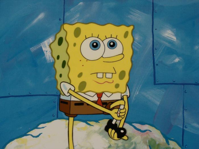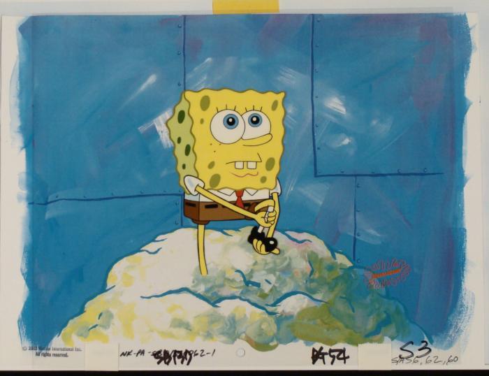 This animation cel and reproduction background are from the Nickelodeon TV show SpongeBob Squarepants. The story takes place under the deep blue sea in Bikini Bottom, where SpongeBob resides. SpongeBob, who is a yellow, porous sponge, is your typical happy-go-lucky character, as he is always cheerful and enjoys making people laugh. Patrick Star, SpongeBob's neighbor who is a starfish, is your average children's show idiot, as he boasts knowing nothing and is often getting himself into ridiculous situations. Between the homes of these two lies the home of the miserable Squidward, a squid, who is known for being grouchy and playing tricks on SpongeBob and Patrick. Both SpongeBob and Squidward work at the Krusty Krab, a fast food business run by the greedy money-loving Mr. Krabs, a crab, the arch rival of the evil, possibly misunderstood, Plankton. Another neighbor, Sandy Cheeks, an athletic squirrel who normally wears an astronaut's space suit, was introduced in "Tea at the Treedome." She spends most of her time inventing and experimenting. What is SpongeBob stepping in?Original Printed Background and Animated Cel Overall Size of Background: 11" x 17" Overall Size of the Cel: 10 1/2" x 12 1/2" Very good condition This is an original hand-painted cel set-up used in the production of an episode of "SpongeBob SquarePants." Each one-of-a-kind set-up represents a slight change in position of the characters. When individually photographed and projected in rapid succession, the images appear to move.
