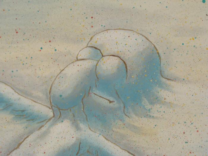 This original hand-painted background from the Nickelodeon TV show SpongeBob Squarepants. The story takes place under the deep blue sea in Bikini Bottom, where SpongeBob resides. SpongeBob, who is a yellow, porous sponge, is your typical happy-go-lucky character, as he is always cheerful and enjoys making people laugh. Patrick Star, SpongeBob's neighbor who is a starfish, is your average children's show idiot, as he boasts knowing nothing and is often getting himself into ridiculous situations. Between the homes of these two lies the home of the miserable Squidward, a squid, who is known for being grouchy and playing tricks on SpongeBob and Patrick. Both SpongeBob and Squidward work at the Krusty Krab, a fast food business run by the greedy money-loving Mr. Krabs, a crab, the arch rival of the evil, possibly misunderstood, Plankton. Another neighbor, Sandy Cheeks, an athletic squirrel who normally wears an astronaut's space suit, was introduced in "Tea at the Treedome." She spends most of her time inventing and experimenting. Squidward seems to be covered with sand.Original Production Background Overall Size of Background: 10" x 12 1/2" Very good condition; it has been stored Original Production Backgrounds are used in the making of the final version of animated productions. The background establishes the location and the overall good mood of the scenee. Typically, a background layout artist creates a drawing to establish the content of the scene, placement of characters, perspective and camera angle. Based on this drawing, the background artist creates a preliminary painting to confirm all of the scenes details, then the final production background which is used in the filming of the scene. When these backgrounds are individually photographed behind the progression of production cels, and projected at a rapid succession, the images in the foreground appear to move, creating an animated scene. The background is ready to be matted and framed. It is a colored background with the animator's notations at the bottom.