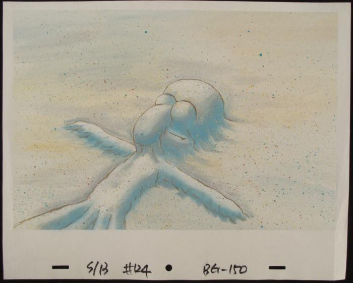 This original hand-painted background from the Nickelodeon TV show SpongeBob Squarepants. The story takes place under the deep blue sea in Bikini Bottom, where SpongeBob resides. SpongeBob, who is a yellow, porous sponge, is your typical happy-go-lucky character, as he is always cheerful and enjoys making people laugh. Patrick Star, SpongeBob's neighbor who is a starfish, is your average children's show idiot, as he boasts knowing nothing and is often getting himself into ridiculous situations. Between the homes of these two lies the home of the miserable Squidward, a squid, who is known for being grouchy and playing tricks on SpongeBob and Patrick. Both SpongeBob and Squidward work at the Krusty Krab, a fast food business run by the greedy money-loving Mr. Krabs, a crab, the arch rival of the evil, possibly misunderstood, Plankton. Another neighbor, Sandy Cheeks, an athletic squirrel who normally wears an astronaut's space suit, was introduced in "Tea at the Treedome." She spends most of her time inventing and experimenting. Squidward seems to be covered with sand.Original Production Background Overall Size of Background: 10" x 12 1/2" Very good condition; it has been stored Original Production Backgrounds are used in the making of the final version of animated productions. The background establishes the location and the overall good mood of the scenee. Typically, a background layout artist creates a drawing to establish the content of the scene, placement of characters, perspective and camera angle. Based on this drawing, the background artist creates a preliminary painting to confirm all of the scenes details, then the final production background which is used in the filming of the scene. When these backgrounds are individually photographed behind the progression of production cels, and projected at a rapid succession, the images in the foreground appear to move, creating an animated scene. The background is ready to be matted and framed. It is a colored background with the animator's notations at the bottom.
