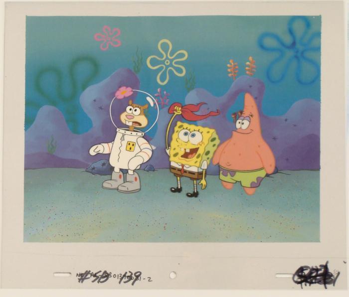 To create production cels, the original animator's drawing is transferred onto an acetate cel (by hand-inking and/or photo copying). The cel is then hand-painted on the reverse side. The background accompanying this set-up is a hand-painted original production background. The printed background is ready to be matted and framed. It is a colored background with a cel and has the animator's notations at the bottom of the background and the cel. The background is a printed reproduction background. The cel has multiple layers; first is SpongeBob, the second cel is Sandy's eyes, the third cel is Sandy and finally the forth cel is Patrick. There is some slight paint fade to SpongeBob's outline.