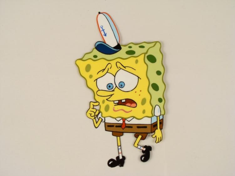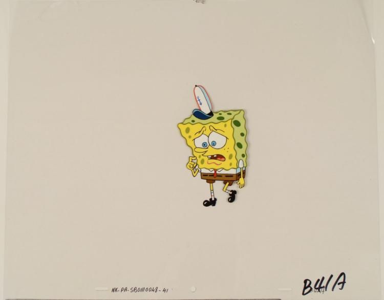 This original hand-painted cel is from the Nickelodeon TV show SpongeBob Squarepants. The story takes place under the deep blue sea in Bikini Bottom, where SpongeBob resides. SpongeBob, who is a yellow, porous sponge, is your typical happy-go-lucky character, as he is always cheerful and enjoys making people laugh. Patrick Star, SpongeBob's neighbor who is a starfish, boasts knowing nothing and is often getting himself into ridiculous situations. Between the homes of these two lies the home of the miserable Squidward, a squid, who is known for being grouchy and playing tricks on SpongeBob and Patrick. Both SpongeBob and Squidward work at the Krusty Krab, a fast food business run by the greedy money-loving Mr. Krabs, a crab, the arch rival of the evil, possibly misunderstood, Plankton. Another neighbor, Sandy Cheeks, an athletic squirrel who normally wears an astronaut's space suit, was introduced in "Tea at the Treedome." She spends most of her time inventing and experimenting. In this large animation cel, SpongeBob looks a bit worried. * * Overall size of cel: 16 1/2" x 13 1/2"Very good condition * This is an original hand-painted cel set-up used in the production of an episode of "SpongeBob SquarePants." Each one-of-a-kind set-up represents a slight change in position of the characters. When individually photographed and projected in rapid succession, the images appear to move. * To create production cels, the original animator's drawing is transferred onto an acetate cel (by hand-inking and/or photo copying). The cel is then hand-painted on the reverse side * The bottom of the sheet has peg holes, and the animator's notations. *