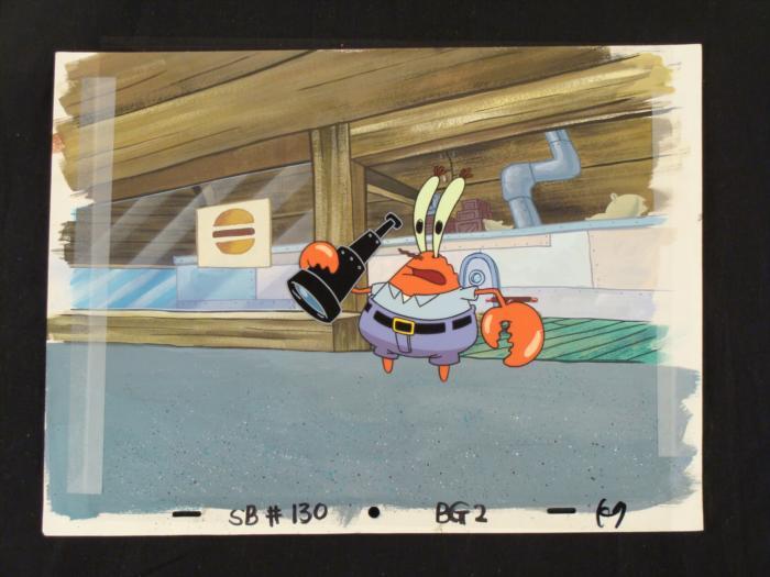 This original hand-painted background and animation cel is from the Nickelodeon TV show SpongeBob Squarepants. The story takes place under the deep blue sea in Bikini Bottom, where SpongeBob resides. SpongeBob, who is a yellow, porous sponge, is your typical happy-go-lucky character, as he is always cheerful and enjoys making people laugh. Patrick Star, SpongeBob's neighbor who is a starfish, is your average children's show idiot, as he boasts knowing nothing and is often getting himself into ridiculous situations. Between the homes of these two lies the home of the miserable Squidward, a squid, who is known for being grouchy and playing tricks on SpongeBob and Patrick. Both SpongeBob and Squidward work at the Krusty Krab, a fast food business run by the greedy money-loving Mr. Krabs, a crab, the arch rival of the evil, possibly misunderstood, Plankton. Another neighbor, Sandy Cheeks, an athletic squirrel who normally wears an astronaut's space suit, was introduced in "Tea at the Treedome." She spends most of her time inventing and experimenting. Mr. Krabs seems to be amazed at something.Original Production Background and Animated Cel Overall Size of Background: 11" x 14" Overall Size of the Cels: 10 1/2" x 12 1/2" Very good condition; it has been stored This is an original hand-painted cel set-up used in the production of an episode of "SpongeBob SquarePants." Each one-of-a-kind set-up represents a slight change in position of the characters. When individually photographed and projected in rapid succession, the images appear to move.