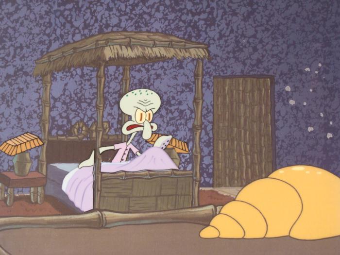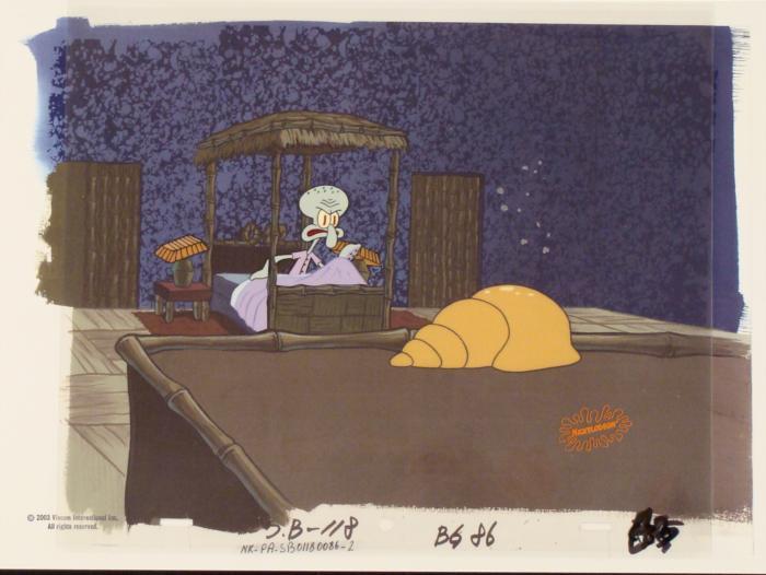 This animation cel and reproduction background are from the Nickelodeon TV show SpongeBob Squarepants. The story takes place under the deep blue sea in Bikini Bottom, where SpongeBob resides. SpongeBob, who is a yellow, porous sponge, is your typical happy-go-lucky character, as he is always cheerful and enjoys making people laugh. Patrick Star, SpongeBob's neighbor who is a starfish, is your average children's show idiot, as he boasts knowing nothing and is often getting himself into ridiculous situations. Between the homes of these two lies the home of the miserable Squidward, a squid, who is known for being grouchy and playing tricks on SpongeBob and Patrick. Both SpongeBob and Squidward work at the Krusty Krab, a fast food business run by the greedy money-loving Mr. Krabs, a crab, the arch rival of the evil, possibly misunderstood, Plankton. Another neighbor, Sandy Cheeks, an athletic squirrel who normally wears an astronaut's space suit, was introduced in "Tea at the Treedome." She spends most of her time inventing and experimenting. Squidward was woken up by something.Original Printed Background and Animated Cel Overall Size of Background: 11" x 17" Overall Size of the Cel: 10 1/2" x 12 1/2" Very good condition This is an original hand-painted cel set-up used in the production of an episode of "SpongeBob SquarePants." Each one-of-a-kind set-up represents a slight change in position of the characters. When individually photographed and projected in rapid succession, the images appear to move.