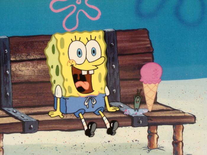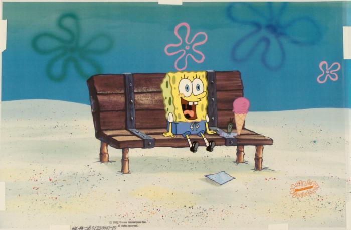 This animation cel and reproduction background are from the Nickelodeon TV show SpongeBob Squarepants. The story takes place under the deep blue sea in Bikini Bottom, where SpongeBob resides. SpongeBob, who is a yellow, porous sponge, is your typical happy-go-lucky character, as he is always cheerful and enjoys making people laugh. Patrick Star, SpongeBob's neighbor who is a starfish, is your average children's show idiot, as he boasts knowing nothing and is often getting himself into ridiculous situations. Between the homes of these two lies the home of the miserable Squidward, a squid, who is known for being grouchy and playing tricks on SpongeBob and Patrick. Both SpongeBob and Squidward work at the Krusty Krab, a fast food business run by the greedy money-loving Mr. Krabs, a crab, the arch rival of the evil, possibly misunderstood, Plankton. Another neighbor, Sandy Cheeks, an athletic squirrel who normally wears an astronaut's space suit, was introduced in "Tea at the Treedome." She spends most of her time inventing and experimenting. Plankton is trying to make SpongeBob more assertive.Original Printed Background and Animated Cel Overall Size of Background: 11" x 17" Overall Size of the Cel: 11" x 16 1/2" Very good condition This is an original hand-painted cel set-up used in the production of an episode of "SpongeBob SquarePants." Each one-of-a-kind set-up represents a slight change in position of the characters. When individually photographed and projected in rapid succession, the images appear to move.