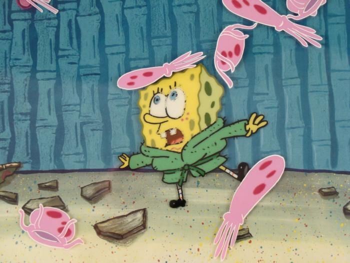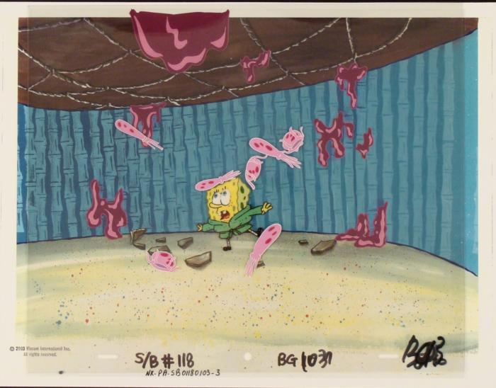This animation cel and reproduction background are from the Nickelodeon TV show SpongeBob Squarepants. The story takes place under the deep blue sea in Bikini Bottom, where SpongeBob resides. SpongeBob, who is a yellow, porous sponge, is your typical happy-go-lucky character, as he is always cheerful and enjoys making people laugh. Patrick Star, SpongeBob's neighbor who is a starfish, is your average children's show idiot, as he boasts knowing nothing and is often getting himself into ridiculous situations. Between the homes of these two lies the home of the miserable Squidward, a squid, who is known for being grouchy and playing tricks on SpongeBob and Patrick. Both SpongeBob and Squidward work at the Krusty Krab, a fast food business run by the greedy money-loving Mr. Krabs, a crab, the arch rival of the evil, possibly misunderstood, Plankton. Another neighbor, Sandy Cheeks, an athletic squirrel who normally wears an astronaut's space suit, was introduced in "Tea at the Treedome." She spends most of her time inventing and experimenting. Are the jellyfish attacking SpongeBob?Original Printed Background and Animated Cel Overall Size of Background: 11" x 17" Overall Size of the Cel: 10 1/2" x 12 1/2" Very good condition This is an original hand-painted cel set-up used in the production of an episode of "SpongeBob SquarePants." Each one-of-a-kind set-up represents a slight change in position of the characters. When individually photographed and projected in rapid succession, the images appear to move.