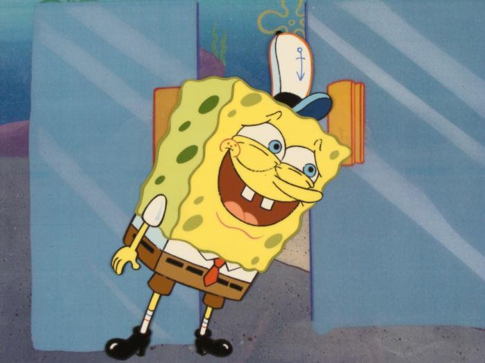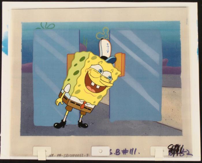 This animation cel and reproduction background are from the Nickelodeon TV show SpongeBob Squarepants. The story takes place under the deep blue sea in Bikini Bottom, where SpongeBob resides. SpongeBob, who is a yellow, porous sponge, is your typical happy-go-lucky character, as he is always cheerful and enjoys making people laugh. Patrick Star, SpongeBob's neighbor who is a starfish, is your average children's show idiot, as he boasts knowing nothing and is often getting himself into ridiculous situations. Between the homes of these two lies the home of the miserable Squidward, a squid, who is known for being grouchy and playing tricks on SpongeBob and Patrick. Both SpongeBob and Squidward work at the Krusty Krab, a fast food business run by the greedy money-loving Mr. Krabs, a crab, the arch rival of the evil, possibly misunderstood, Plankton. Another neighbor, Sandy Cheeks, an athletic squirrel who normally wears an astronaut's space suit, was introduced in "Tea at the Treedome." She spends most of her time inventing and experimenting. SpongeBob appears to be stumblingOriginal Printed Background and Animated Cel Overall Size of Background: 11" x 13 3/4" Overall Size of the Cel: 10 1/2" x 12 1/2" Very good condition; it has been storedThis is an original hand-painted cel set-up used in the production of an episode of "SpongeBob SquarePants." Each one-of-a-kind set-up represents a slight change in position of the characters. When individually photographed and projected in rapid succession, the images appear to move.