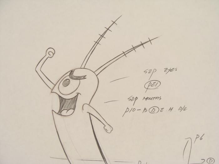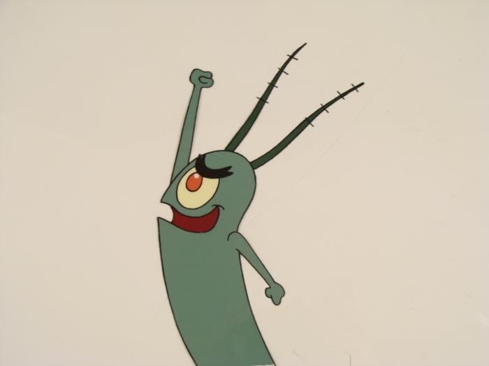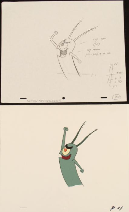 This original animation cel is from the Nickelodeon TV show SpongeBob Squarepants. The story takes place under the deep blue sea in Bikini Bottom, where SpongeBob resides. SpongeBob, who is a yellow, porous sponge, is your typical happy-go-lucky character, as he is always cheerful and enjoys making people laugh. Patrick Star, SpongeBob's neighbor who is a starfish, is your average children's show idiot, as he boasts knowing nothing and is often getting himself into ridiculous situations. Between the homes of these two lies the home of the miserable Squidward, a squid, who is known for being grouchy and playing tricks on SpongeBob and Patrick. Both SpongeBob and Squidward work at the Krusty Krab, a fast food business run by the greedy money-loving Mr. Krabs, a crab, the arch rival of the evil, possibly misunderstood, Plankton. Another neighbor, Sandy Cheeks, an athletic squirrel who normally wears an astronaut's space suit, was introduced in "Tea at the Treedome." She spends most of her time inventing and experimenting. Plankton has acheived victory.Original Production Animated Cel and Drawing Original "rough" animation drawing, in black and brown pencil, with notations in black. Overall Size of Drawing: 10 1/2" x 12 1/2" Overall Size of Cel: 10 1/2" x 12 1/2" Excellent ConditionThis is an original hand-painted cel set-up used in the production of an episode of "SpongeBob SquarePants." Each one-of-a-kind set-up represents a slight change in position of the characters. When individually photographed and projected in rapid succession, the images appear to move.