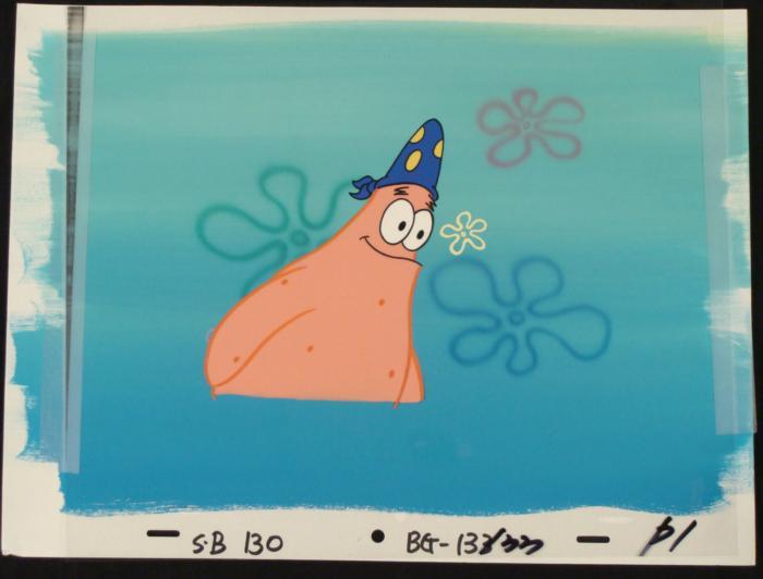 This original hand-painted background and animation cel is from the Nickelodeon TV show SpongeBob Squarepants. The story takes place under the deep blue sea in Bikini Bottom, where SpongeBob resides. SpongeBob, who is a yellow, porous sponge, is your typical happy-go-lucky character, as he is always cheerful and enjoys making people laugh. Patrick Star, SpongeBob's neighbor who is a starfish, is your average children's show idiot, as he boasts knowing nothing and is often getting himself into ridiculous situations. Between the homes of these two lies the home of the miserable Squidward, a squid, who is known for being grouchy and playing tricks on SpongeBob and Patrick. Both SpongeBob and Squidward work at the Krusty Krab, a fast food business run by the greedy money-loving Mr. Krabs, a crab, the arch rival of the evil, possibly misunderstood, Plankton. Another neighbor, Sandy Cheeks, an athletic squirrel who normally wears an astronaut's space suit, was introduced in "Tea at the Treedome." She spends most of her time inventing and experimenting. Patrick is wearing a blue hat on his head.Original Production Background and Animated Cel Overall Size of Background: 10 1/2" x 14" Overall Size of the Cels: 10 1/2" x 12 1/2" Very good condition; it has been stored This is an original hand-painted cel set-up used in the production of an episode of "SpongeBob SquarePants." Each one-of-a-kind set-up represents a slight change in position of the characters. When individually photographed and projected in rapid succession, the images appear to move.