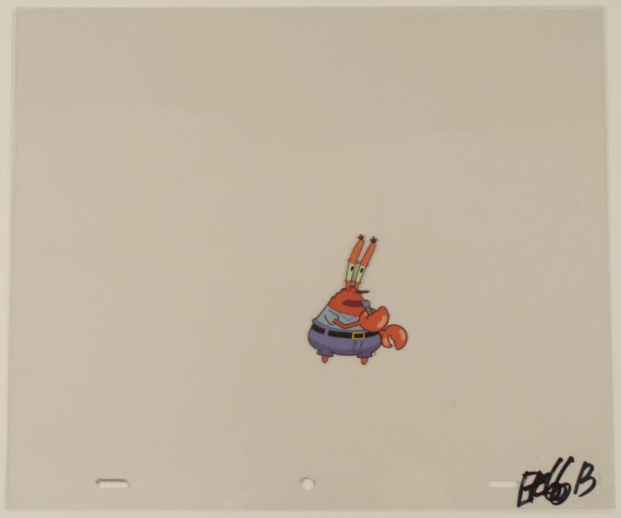 To create production cels, the original animator's drawing is transferred onto an acetate cel (by hand-inking and/or photo copying). The cel is then hand-painted on the reverse side. The cel is ready to be matted and framed. The animator's notations are at the bottom of the cel. There is some slight paint fade to Mr. Krab's outline. The cel has multiple layers; first is Mr. Krab's eyes, then Mr. Krab's mouth, and finally Mr. Krab's body.