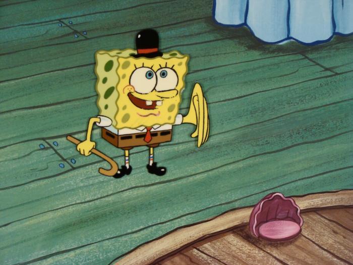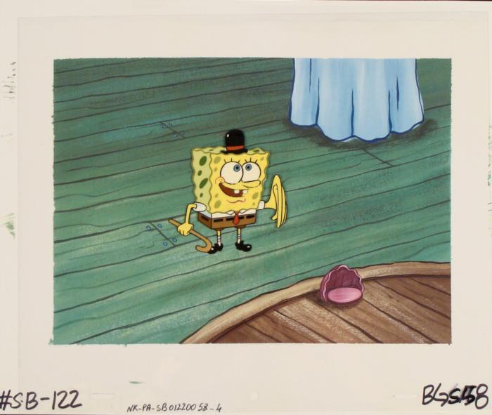 This animation cel and reproduction background are from the Nickelodeon TV show SpongeBob Squarepants. The story takes place under the deep blue sea in Bikini Bottom, where SpongeBob resides. SpongeBob, who is a yellow, porous sponge, is your typical happy-go-lucky character, as he is always cheerful and enjoys making people laugh. Patrick Star, SpongeBob's neighbor who is a starfish, is your average children's show idiot, as he boasts knowing nothing and is often getting himself into ridiculous situations. Between the homes of these two lies the home of the miserable Squidward, a squid, who is known for being grouchy and playing tricks on SpongeBob and Patrick. Both SpongeBob and Squidward work at the Krusty Krab, a fast food business run by the greedy money-loving Mr. Krabs, a crab, the arch rival of the evil, possibly misunderstood, Plankton. Another neighbor, Sandy Cheeks, an athletic squirrel who normally wears an astronaut's space suit, was introduced in "Tea at the Treedome." She spends most of her time inventing and experimenting. Spongebob the entertainer...Original Printed Background and Animated Cel Overall Size of Background: 11" x 17" Overall Size of the Cel: 10 1/2" x 12 1/2" Very good condition This is an original hand-painted cel set-up used in the production of an episode of "SpongeBob SquarePants." Each one-of-a-kind set-up represents a slight change in position of the characters. When individually photographed and projected in rapid succession, the images appear to move.