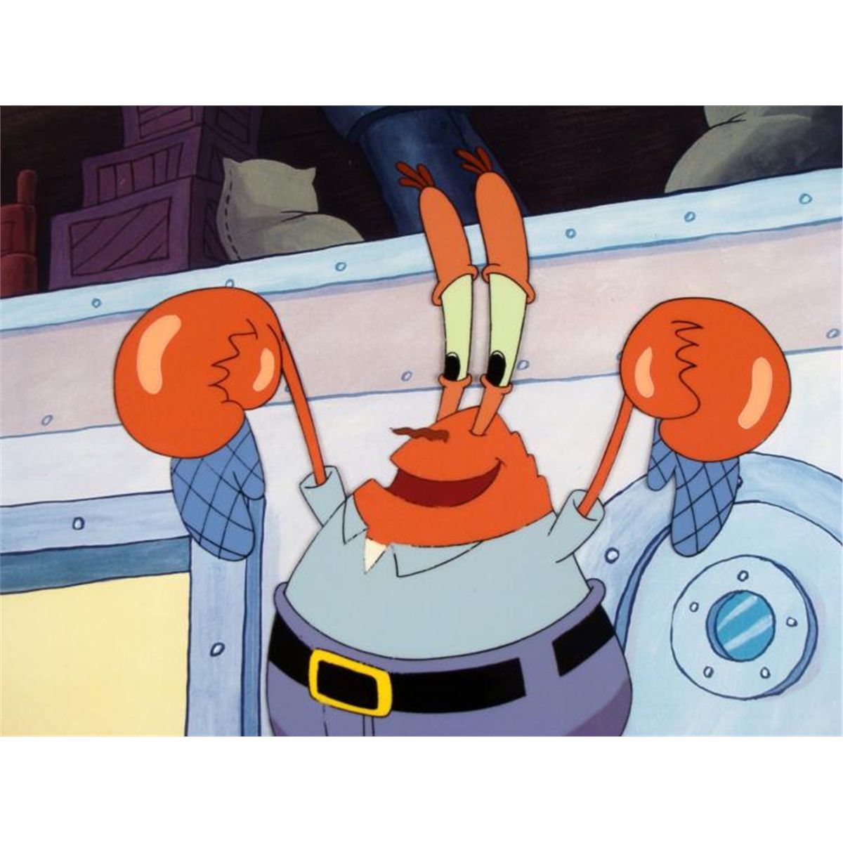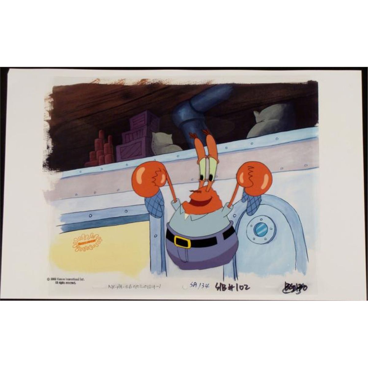 This animation cel and reproduction background are from the Nickelodeon TV show SpongeBob Squarepants, from the episode titled "Squeaky Boots". The story takes place under the deep blue sea in Bikini Bottom, where SpongeBob resides. SpongeBob, who is a yellow, porous sponge, is your typical happy-go-lucky character, as he is always cheerful and enjoys making people laugh. Patrick Star, SpongeBob's neighbor who is a starfish, is your average children's show idiot, as he boasts knowing nothing and is often getting himself into ridiculous situations. Between the homes of these two lies the home of the miserable Squidward, a squid, who is known for being grouchy and playing tricks on SpongeBob and Patrick. Both SpongeBob and Squidward work at the Krusty Krab, a fast food business run by the greedy money-loving Mr. Krabs, a crab, the arch rival of the evil, possibly misunderstood, Plankton. Another neighbor, Sandy Cheeks, an athletic squirrel who normally wears an astronaut's space suit, was introduced in "Tea at the Treedome." She spends most of her time inventing and experimenting. * You're going to need mits if you plan on moving that hot pot... * Original Printed Background and Animated Cel Overall Size of Background: 11" x 17" Overall Size of the Cel: 10 1/2" x 12 1/2" Very good condition This is an original hand-painted cel set-up used in the production of an episode of "SpongeBob SquarePants." Each one-of-a-kind set-up represents a slight change in position of the characters. When individually photographed and projected in rapid succession, the images appear to move. * To create production cels, the original animator's drawing is transferred onto an acetate cel (by hand-inking and/or photo copying). The cel is then hand-painted on the reverse side. The background accompanying this set-up is a reproduction background. * The cel received by the winning bidder may be ever so slightly different from the one in the auction photos. * The printed background and cel are ready to be matted and framed. The notations are located at the bottom of both. The Nickelodeon logo is located at the bottom left of the cel. There is some paint fade to Mr. Krab's outline. *