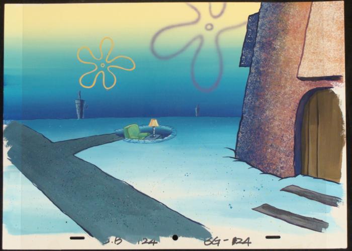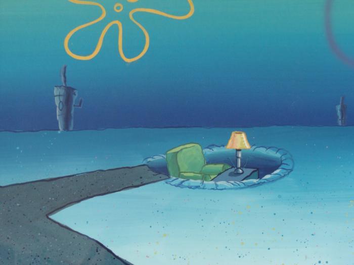 This original hand-painted background and animation cel are from the Nickelodeon TV show SpongeBob Squarepants. The story takes place under the deep blue sea in Bikini Bottom, where SpongeBob resides. SpongeBob, who is a yellow, porous sponge, is your typical happy-go-lucky character, as he is always cheerful and enjoys making people laugh. Patrick Star, SpongeBob's neighbor who is a starfish, is your average children's show idiot, as he boasts knowing nothing and is often getting himself into ridiculous situations. Between the homes of these two lies the home of the miserable Squidward, a squid, who is known for being grouchy and playing tricks on SpongeBob and Patrick. Both SpongeBob and Squidward work at the Krusty Krab, a fast food business run by the greedy money-loving Mr. Krabs, a crab, the arch rival of the evil, possibly misunderstood, Plankton. Another neighbor, Sandy Cheeks, an athletic squirrel who normally wears an astronaut's space suit, was introduced in "Tea at the Treedome." She spends most of her time inventing and experimenting. It seems to be that Patrick's house is gone.Original Production Background and Animated Cel Overall Size of Background: 10 1/4" x 14" Overall Size of the Cel: 10 1/2" x 12 1/2" Very good condition; it has been stored This is an original hand-painted cel set-up used in the production of an episode of "SpongeBob SquarePants." Each one-of-a-kind set-up represents a slight change in position of the characters. When individually photographed and projected in rapid succession, the images appear to move.
