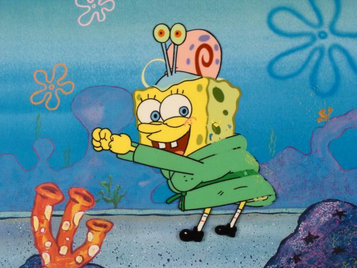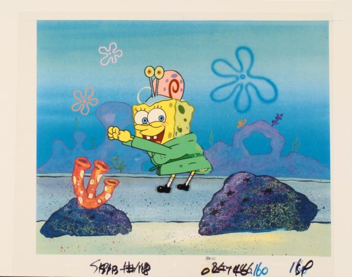 This original animation cel and reproduction background is from the Nickelodeon TV show SpongeBob Squarepants. The story takes place under the deep blue sea in Bikini Bottom, where SpongeBob resides. SpongeBob, who is a yellow, porous sponge, is your typical happy-go-lucky character, as he is always cheerful and enjoys making people laugh. Patrick Star, SpongeBob's neighbor who is a starfish, is your average children's show idiot, as he boasts knowing nothing and is often getting himself into ridiculous situations. Between the homes of these two lies the home of the miserable Squidward, a squid, who is known for being grouchy and playing tricks on SpongeBob and Patrick. Both SpongeBob and Squidward work at the Krusty Krab, a fast food business run by the greedy money-loving Mr. Krabs, a crab, the arch rival of the evil, possibly misunderstood, Plankton. Another neighbor, Sandy Cheeks, an athletic squirrel who normally wears an astronaut's space suit, was introduced in "Tea at the Treedome." She spends most of her time inventing and experimenting. Spongebob knows all the smooth moves... Original Animated Cel and Reproduction BackgroundOverall Size of Background: 11" x 17" Overall Size of the Cel: 10 1/2" x 12 1/2" Very good condition; paint damage to celThis is an original hand-painted cel set-up used in the production of an episode of "SpongeBob SquarePants." Each one-of-a-kind set-up represents a slight change in position of the characters. When individually photographed and projected in rapid succession, the images appear to move.