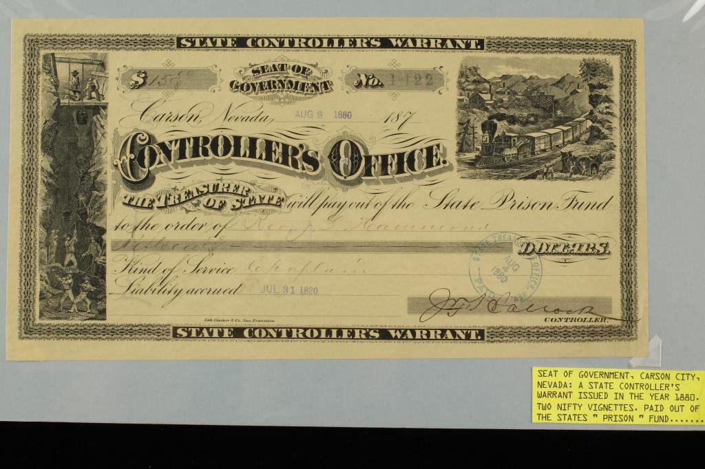 Original State Controller’s Warrant, dated July 31, 1880, from the Nevada State Controller’s Office in Carson City drawing on the State Prison fund to pay for Chaplain services; in overall very good to fine condition. Est.: $25-$50.