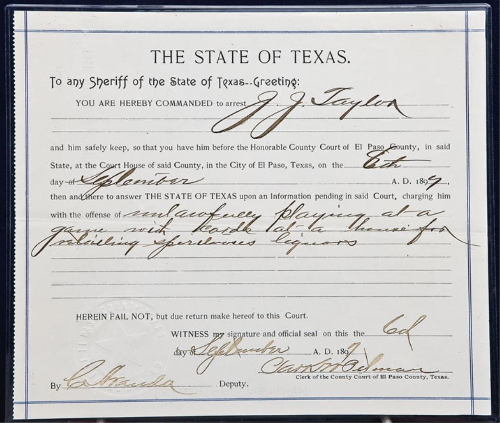 Original State of Texas arrest warrant for any Sheriff of the State of Texas for J.J. Taylor, dated September 6, 1897 signed by famous El Paso County Sheriff F. B. Simmons and Deputy W.J. TenEyck and returned to the Court on September 8, 1897 indicating Taylor was arrested and taken before “the Honorable Court”. The charge on this warrant was “unlawfully playing at a game with cards at a house for retailing spirituous liquors”. J.J. Taylor was the owner of the infamous Gem Saloon in El Paso where John Selman shot and killed gunman and part-time lawyer John Wesley Hardin. The document is two-sided and in very good to excellent condition, approx. 7” x 8”, has the seal imprint of the El Paso County Court and is enclosed in a protective acid free clear sleeve. An important piece of Western history. Est.: $500-$750.