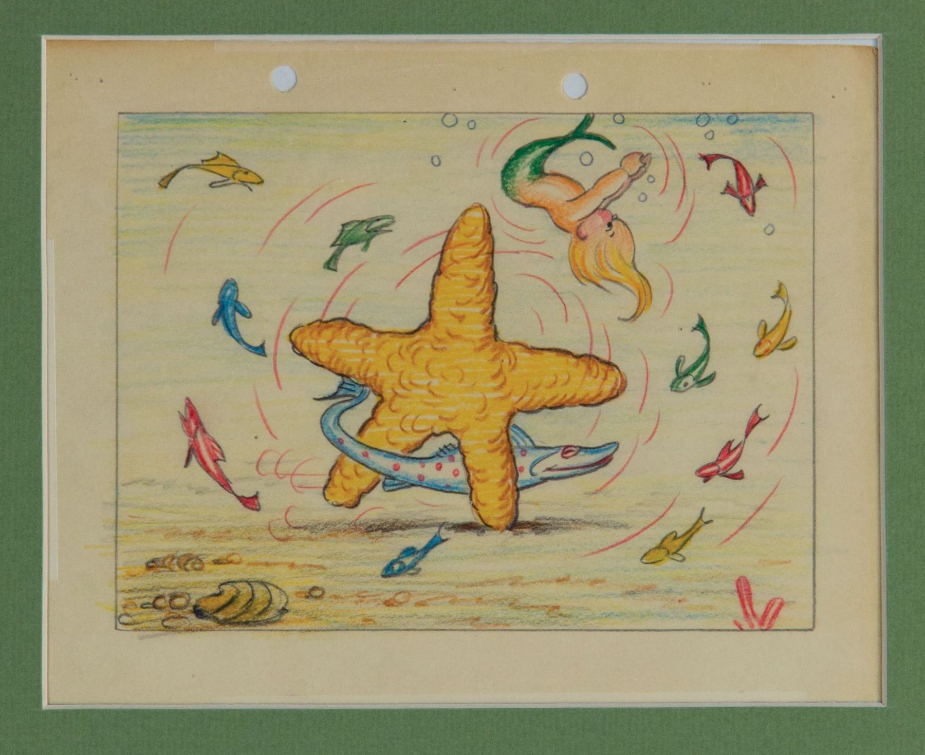(Walt Disney Studios, 1938) An original storyboard drawing from "Merbabies" accomplished in graphite and colored pencil on animation paper. The drawing has an image size of 6.25"x7.75" within its 16"x20" mat and is in very good condition.