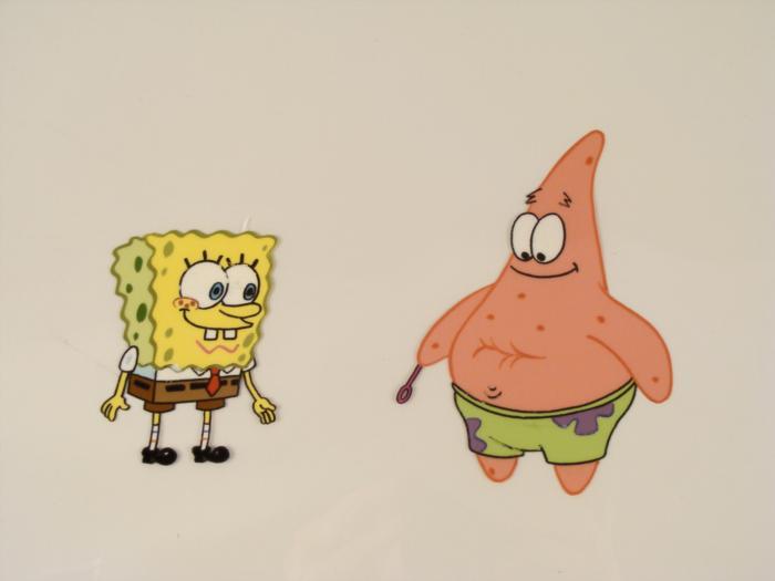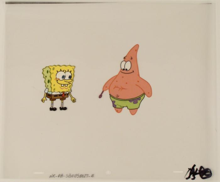 This original animation cel is from the Nickelodeon TV show SpongeBob Squarepants. The story takes place under the deep blue sea in Bikini Bottom, where SpongeBob resides. SpongeBob, who is a yellow, porous sponge, is your typical happy-go-lucky character, as he is always cheerful and enjoys making people laugh. Patrick Star, SpongeBob's neighbor who is a starfish, is your average children's show idiot, as he boasts knowing nothing and is often getting himself into ridiculous situations. Between the homes of these two lies the home of the miserable Squidward, a squid, who is known for being grouchy and playing tricks on SpongeBob and Patrick. Both SpongeBob and Squidward work at the Krusty Krab, a fast food business run by the greedy money-loving Mr. Krabs, a crab, the arch rival of the evil, possibly misunderstood, Plankton. Another neighbor, Sandy Cheeks, an athletic squirrel who normally wears an astronaut's space suit, was introduced in "Tea at the Treedome." She spends most of her time inventing and experimenting.Patrick has sucked in his stomach. Original Production Animated CelOverall Size of Cel: 10 1/2" x 12 1/2" Very Good ConditionThis is an original hand-painted cel set-up used in the production of an episode of "SpongeBob SquarePants." Each one-of-a-kind set-up represents a slight change in position of the characters. When individually photographed and projected in rapid succession, the images appear to move.