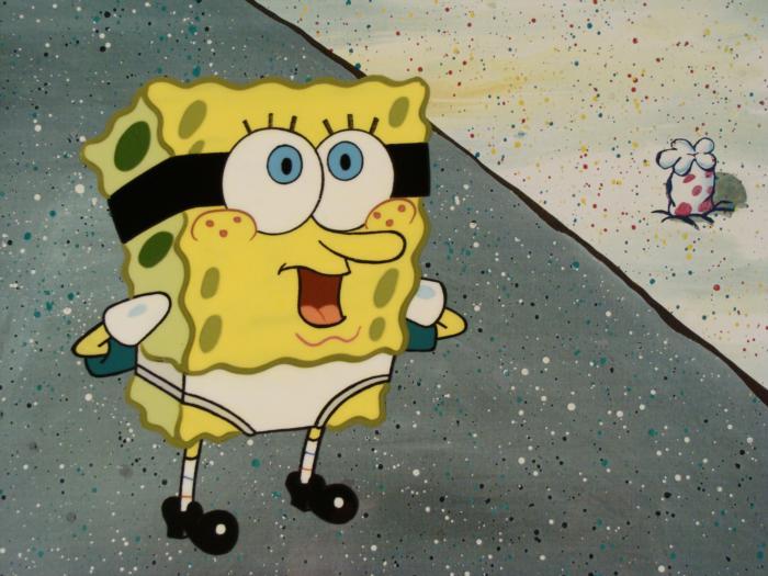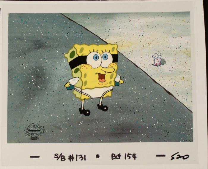 This animation cel and reproduction background are from the Nickelodeon TV show SpongeBob Squarepants. The story takes place under the deep blue sea in Bikini Bottom, where SpongeBob resides. SpongeBob, who is a yellow, porous sponge, is your typical happy-go-lucky character, as he is always cheerful and enjoys making people laugh. Patrick Star, SpongeBob's neighbor who is a starfish, is your average children's show idiot, as he boasts knowing nothing and is often getting himself into ridiculous situations. Between the homes of these two lies the home of the miserable Squidward, a squid, who is known for being grouchy and playing tricks on SpongeBob and Patrick. Both SpongeBob and Squidward work at the Krusty Krab, a fast food business run by the greedy money-loving Mr. Krabs, a crab, the arch rival of the evil, possibly misunderstood, Plankton. Another neighbor, Sandy Cheeks, an athletic squirrel who normally wears an astronaut's space suit, was introduced in "Tea at the Treedome." She spends most of her time inventing and experimenting. SpongeBob is in his super hero costume.Original Printed Background and Animated Cel Overall Size of Background: 10 1/2" x 13 1/2" Overall Size of the Cel: 10 1/2" x 12 1/2" Very good condition This is an original hand-painted cel set-up used in the production of an episode of "SpongeBob SquarePants." Each one-of-a-kind set-up represents a slight change in position of the characters. When individually photographed and projected in rapid succession, the images appear to move.