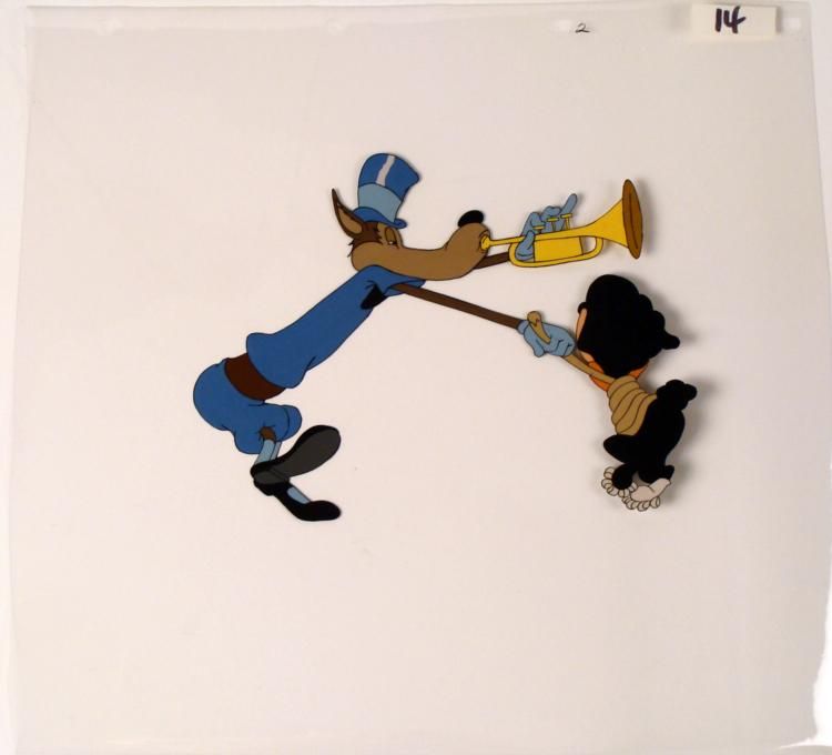 Here the wolf is having a little bit of swing dance party, which is pretty much one sided, because the pig can't go anywhere. This is an original animation cel from the production of a Three Little Pigs animated cartoon. * * * Medium: Hand painted acetate cel with printed backgroundCel size: 13 x 14 inchesDetails: Numbers, top of celCondition: Very good; it has been stored.