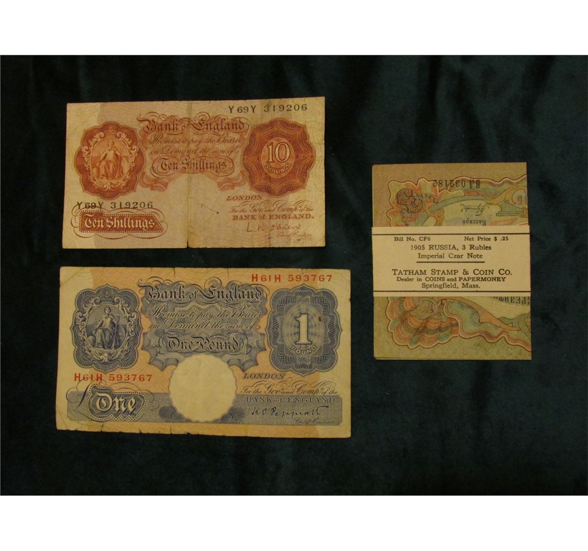 Original Tatham Stamp & Coin Co. paper band around a Crisp unc 1905 Russia, 3 Rubles Imperial Czar Note; early Bank of London One Pound and 10 ShillingsBanknotes