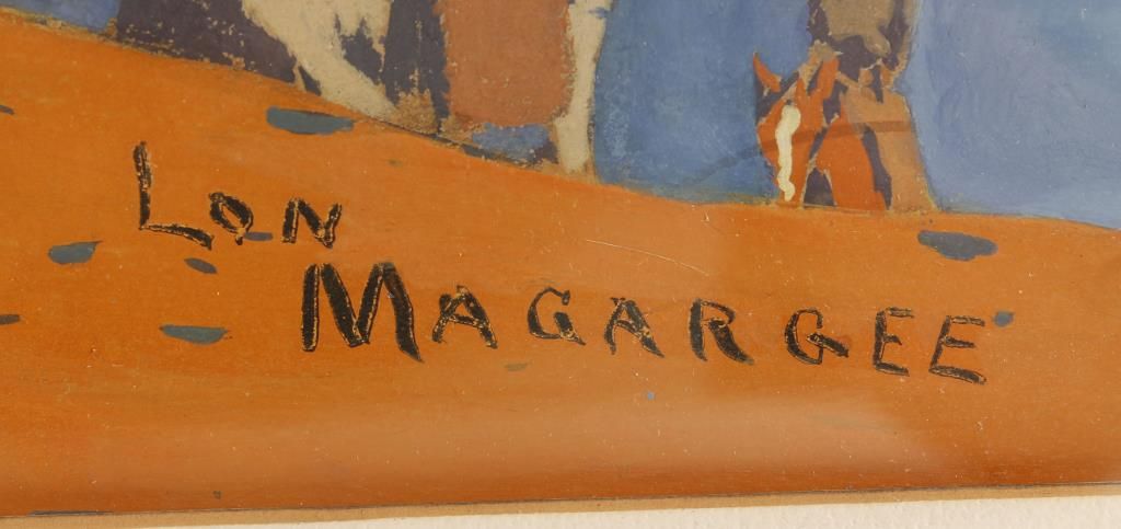 Lon Megargee. Depicting a cowboy on horse. Shows some water damage on matting to right hand corner. Also is hand signed right hand corner. In wormwood frame. With unique arch matting. Image size 37" wide x 20" high. Born and raised in Philadelphia, Pennsylvania, Lon Megargee, at age 13, ran away from his upper class home and went West in 1896 led by his zest for the wild and adventuresome life. There he established a reputation as a cowboy painter and illustrator with work most associated with Arizona Brewing Company ads featuring humorous aspects of cowboy life. In his youth, he worked as a free-lance cowboy, exhibition roper, poker dealer, and bronco buster in Arizona, and then went east again to study art in Philadelphia at the Pennsylvania Academy of Fine Arts, and to New York at the Art Students League and Pratt Institute. He returned to Arizona, living in Cave Creek, Salt River Canyon, Phoenix and the last years of his life near Sedona. His Phoenix home later became a popular hotel and dining place called the Hermosa Inn. Megargee was a ranch owner and also did oil canvases of the places he loved and the cowboy life he admired. By 1910, he was among the earliest resident artists, and was probably the best known artist in Arizona. His name was first associated with a landscape series of 15 large murals for the Capitol Building, newly constructed just after Arizona became a state in 1912. Another one of his paintings, Elemental, was the first painting by an artist living in Arizona to be acquired for the Municipal Collection of Phoenix. These works were chosen from entries in the State Fair, where he continued to win prizes for figure and landscape painting. From 1911 to 1953, he did numerous commission works for the Santa Fe Railroad, including a work titled Navajos Watching a Santa Fe Train. Between 1915 and 1930, he also painted in the Los Angeles area of California and had entries in the California State Fair. He died in Cottonwood, Arizona. After his death, the Saturday Evening Post had a double-page reproduction of his painting Cowboy's Dream.