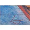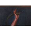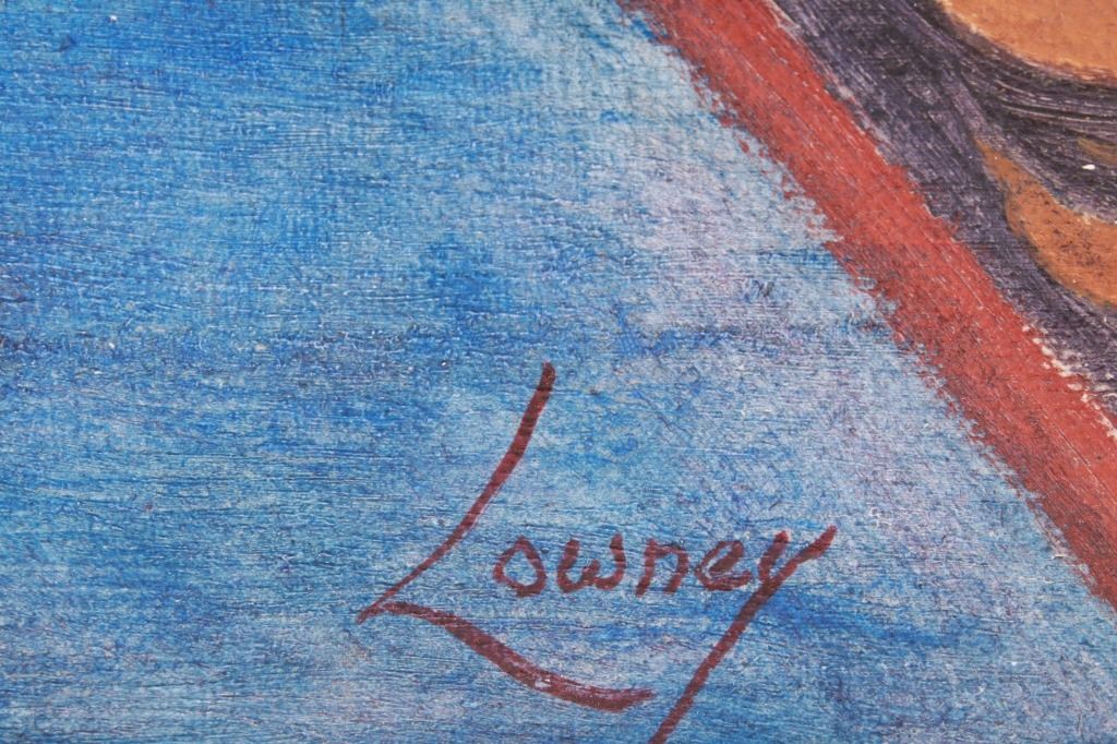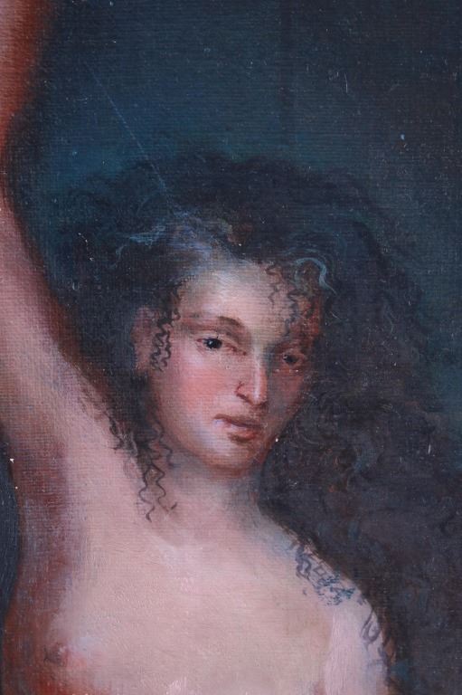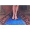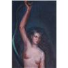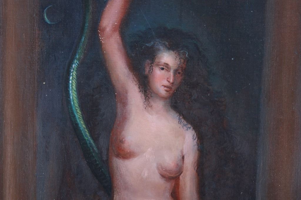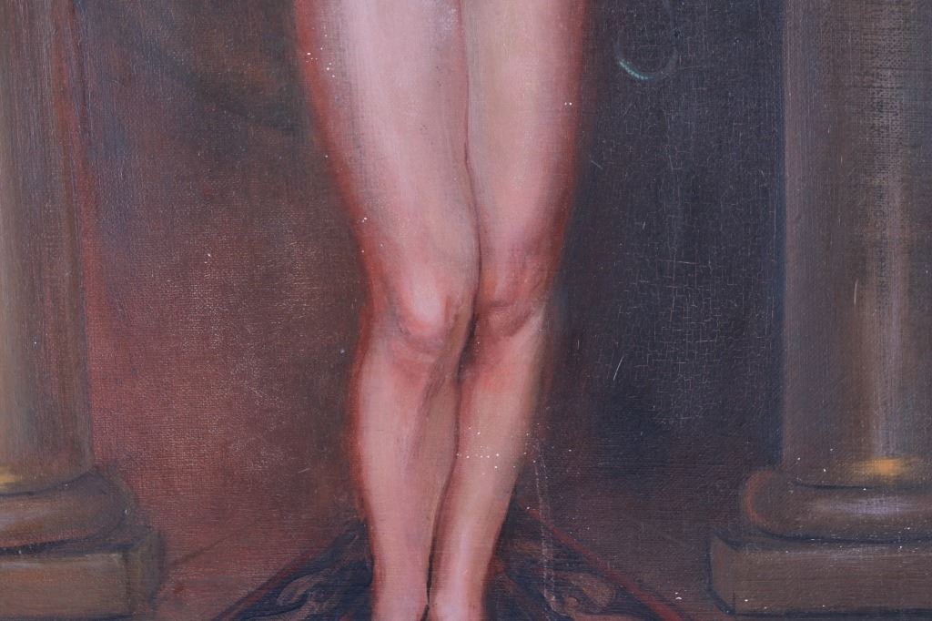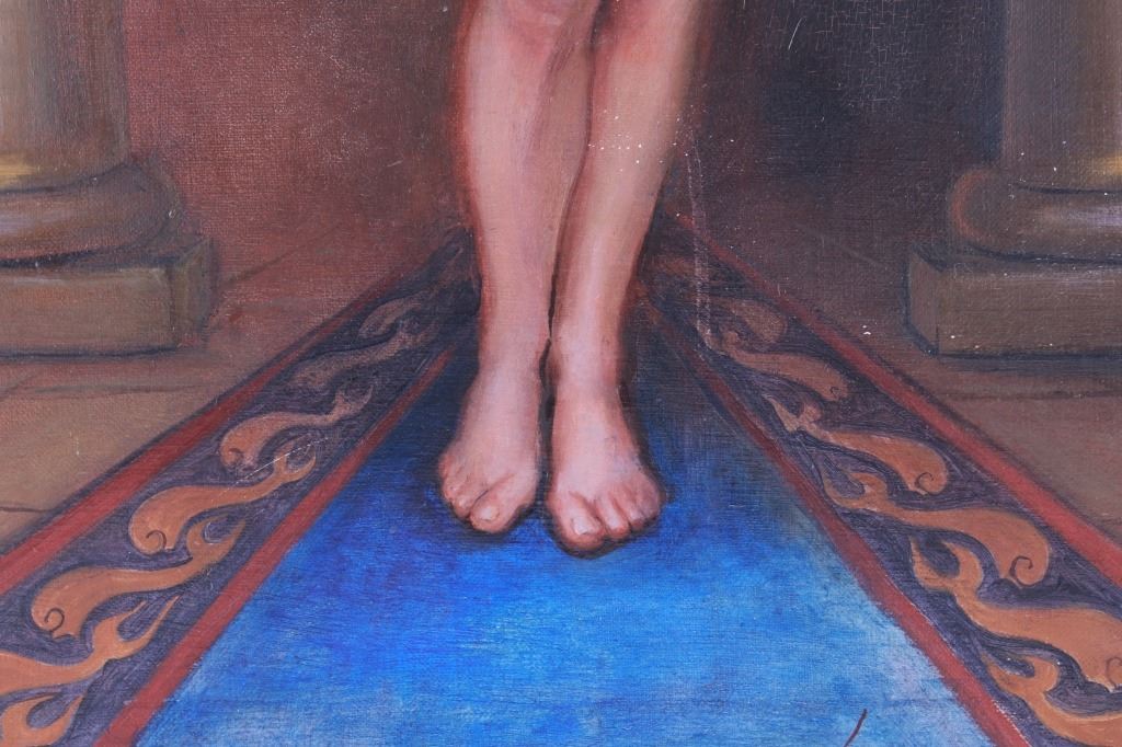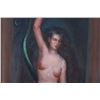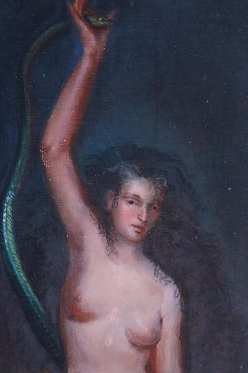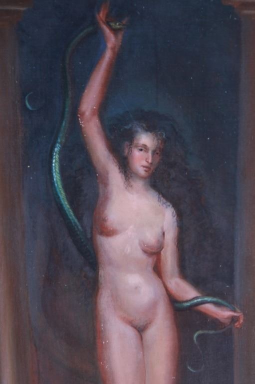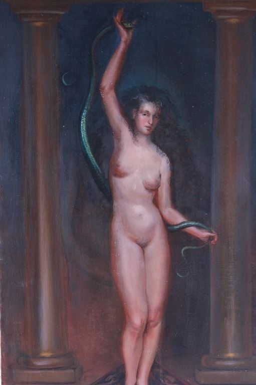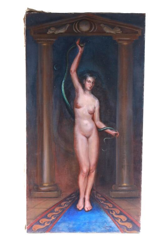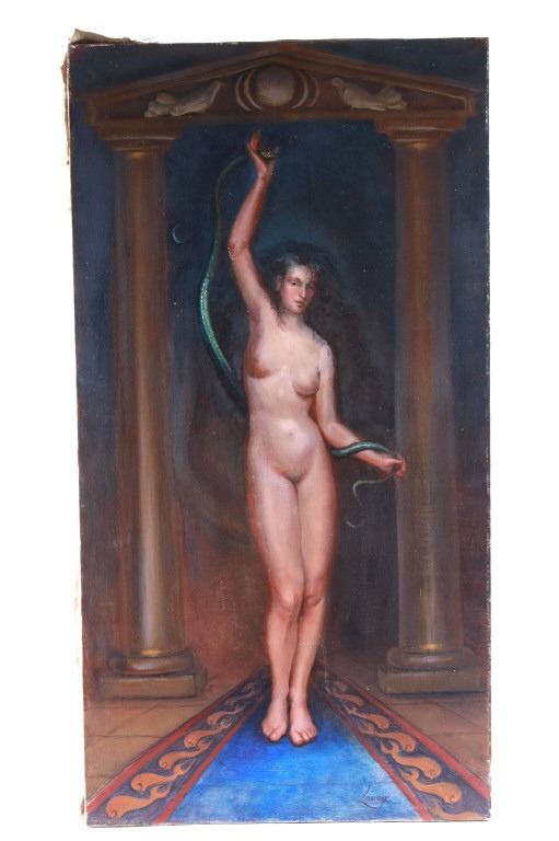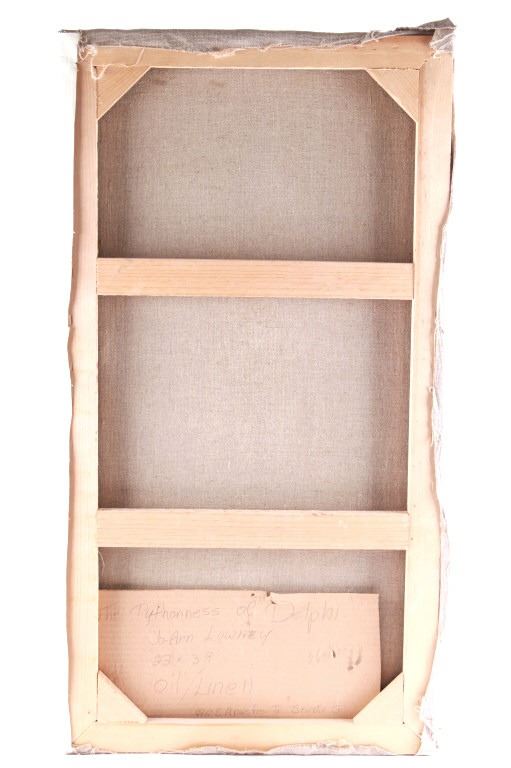 Offered in this lot is The Pythonness Of Delphi by Jo-Ann Lowney (American, b. 1948). This is an original oil painting on linen. Jo-Ann Lowney was born in 1948 in New Bedford, Massachusetts. As a child she lived in Europe, spent her high school years in Miami and in her twenties moved to Portland, Maine where she attended the Main College of Art. She then studied five years with the National Academician, Frank Mason, at The Art Student's League of New York. Since 1986, they have made their home and studios at the East Side Art artist's community in Mesa, Arizona. In 1995 Jo-Ann Lowney was awarded the Visual Art Fellowship in Two Dimensional Media by the Arizona Commission on the Arts. In 1996 she was awarded an Artists in Residency Grant by the Arizona Commission on the Arts for the mural project, A History of Superstition Mountain. This original painting is titled The Pythonness Of Delphi. Pythia was the name of the high priestess of the Temple of Apollo at Delphi. She specifically served as its oracle and was known as the Oracle of Delphi. The painting shows a nude woman holding a serpent on a rug in a temple. This painting has light damage on the edges and some missing flakes of paint. The art canvas measures 36" x 19".