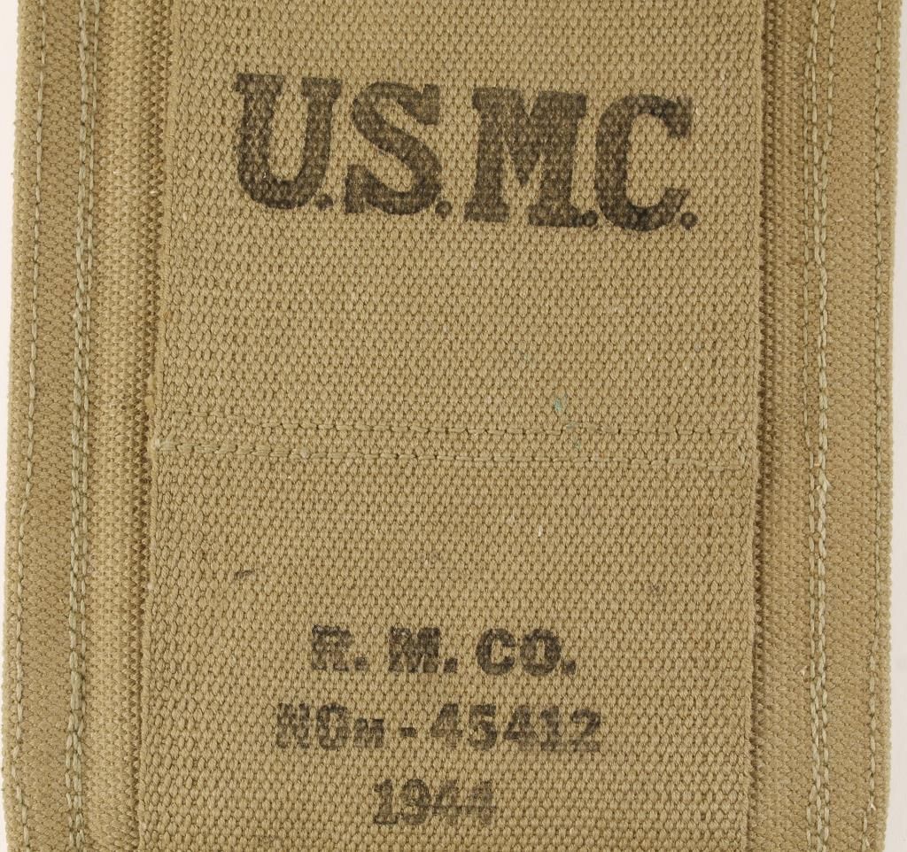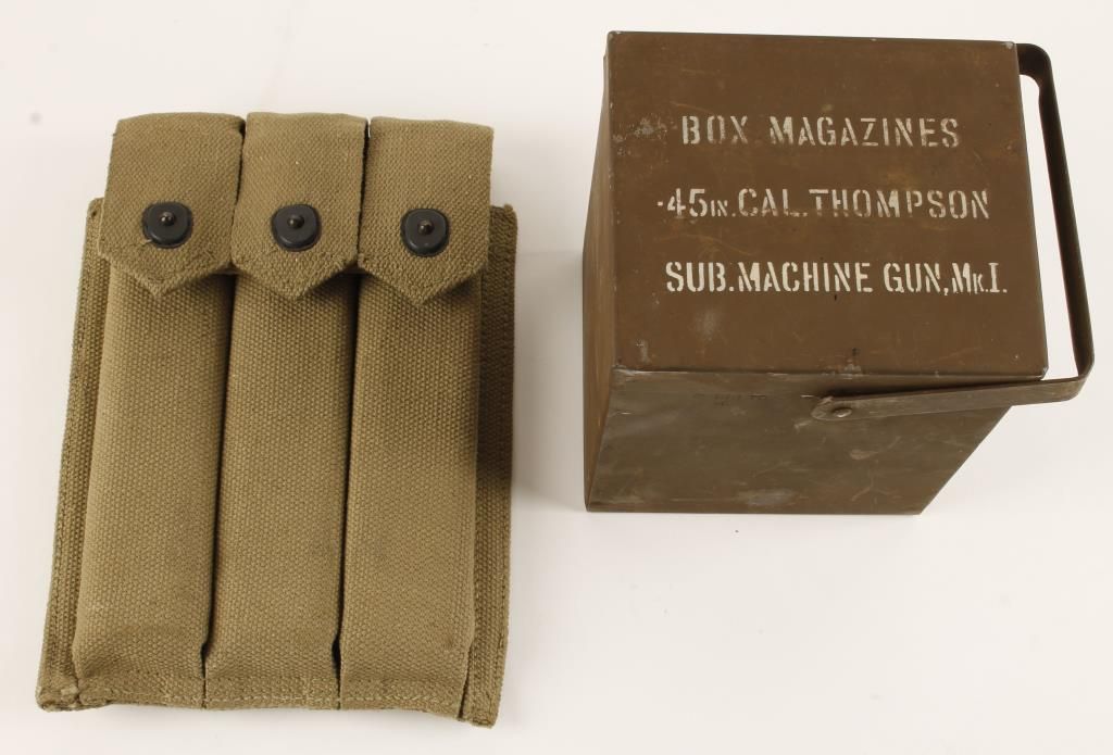 .45auto and a USMC Green Webbing Pouch with Three MINT Thompson Machine Gun Mags .45 auto marked 1944 still in wrapping.