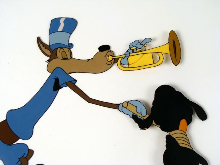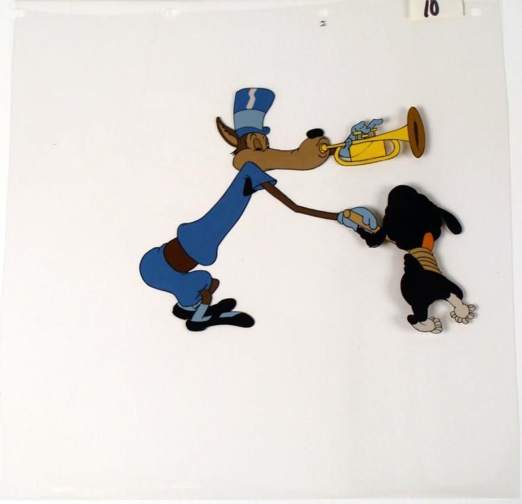 It seems that the wolf is in total control of the situation, but on the other hand the pig appears not to mind being swung in 1,001 circles. This is an original animation cel from the production of a Three Little Pigs animated cartoon. * * * Medium: Hand painted acetate cel with printed backgroundCel size: 13 x 14 inchesDetails: Numbers, top of celCondition: Very good; it has been stored.