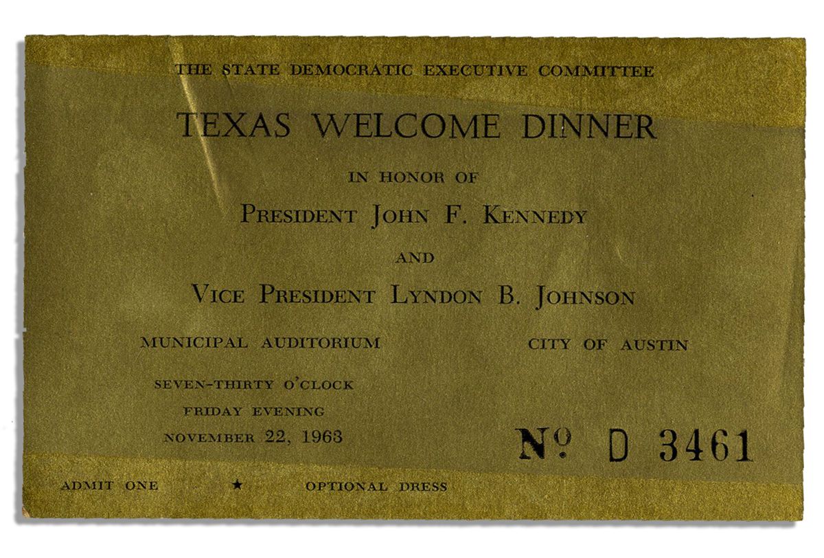 Original unused ticket for the JFK Welcome Dinner slated for the evening of 22 November 1963 in Austin, Texas. The dinner was scheduled to take place at 7:30 p.m. in Austin's Municipal Auditorium to honor President and Mrs. Kennedy, Vice President and Mrs. Johnson. Gold ticket is numbered D 3461 and measures 4'' x 2.5''. One minor crease, else near fine.