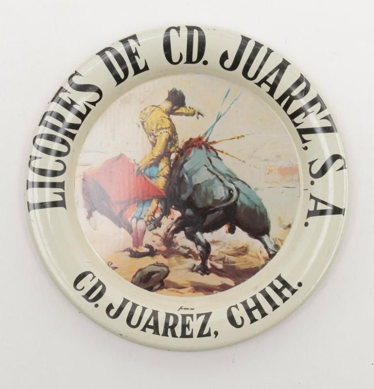Original Tin Advertiser – Licores De CD Juarez, SA “CD Juarez, CHIH”, depicting a bullfighter, bright and colorful, fine to near excellent condition, circular, approx. 4-1/2” in diameter; originally from the Peter Stein estate ofFredricksburg, TX. Est.: $100-$150.
