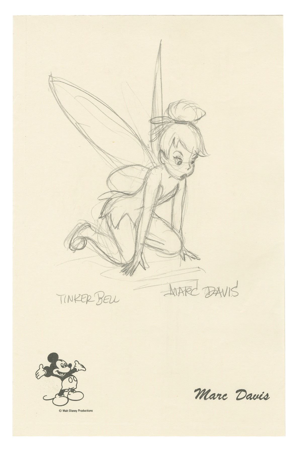 (Walt Disney Studios, c.1980) An original drawing of Tinker Bell by Disney Legend and one of Disney's Nine Old Men, Marc Davis. The drawing is accomplished in pencil on Davis' own Walt Disney Productions stationery and is signed by Davis under the drawing. Measuring 8.5"x5.5", the drawing is in very good condition.