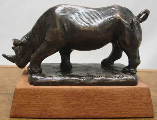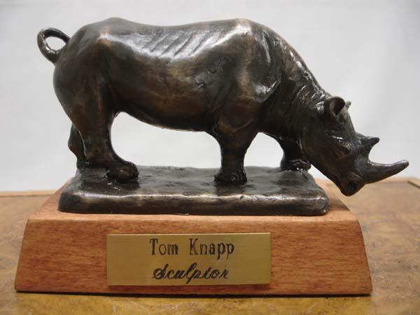 Original Tom Knapp Bronze Rhinoceros Sculpture. Measures 3''x4.5''. Mounted on solid wood block with brass name plate. Buyers Pay Actual Shipping and Handling Charges(see terms and conditions for more information).