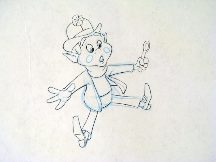 An advertising company employed by General Mills and Company suggested revolving the marketing of the new cereal around the idea of charm bracelets. Thus, the charms of Lucky Charms were born. The mascot, Lucky the Leprechaun (originally called L.C. Leprechaun), created in 1963, is a cartoon character whose voice was supplied by Arthur Anderson until 1992. OH NO!! You're not supposed to eat the whole box in one sitting... Original "rough" animation drawing, in non-photo blue and black with the notations in black.Overall size is a 12-field drawing that is 10 1/2" × 12 1/2"Very Good Condition Traditional animation is a multi-step process which includes various types of art techniques. Drawings are a key part of the process, in which the animator creates the design and movement of the characters. Drawings are then transferred onto acetate cels (by hand-inking and/or photo copying) to create a production cel, which is then hand painted on the back side, using paint colors chosen and approved by the creator of the series. The drawing is ready to be matted and framed. The animators notations are located at the bottom of the drawing. There is some creasing to the top of the drawing.