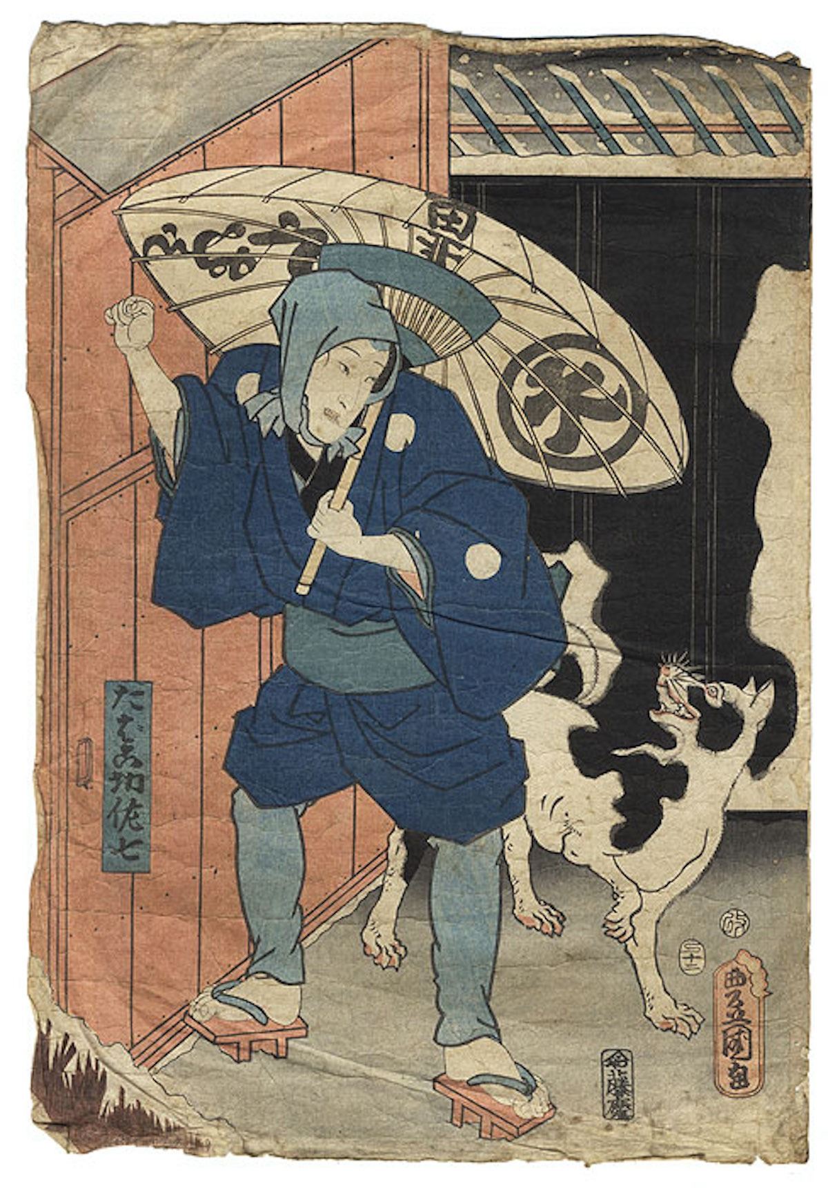 Original Toyokuni III/Kunisada (1786 - 1864) Japanese Woodblock Print, Oban, approximately 14 1/2" x 9 1/2", This print with nice detail as shown. Some staining. Repaired. See photo for details