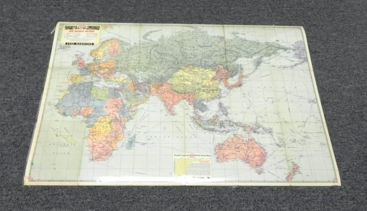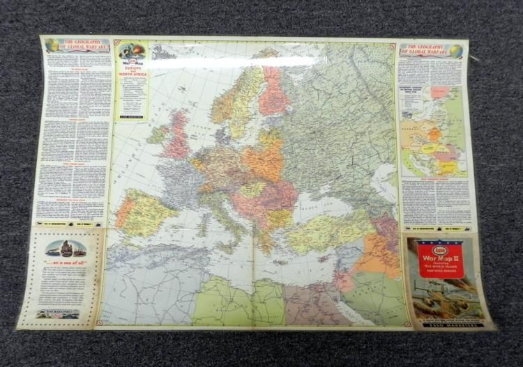 Available is this Original WWII Esso Two Sided Warfare Map. One side shows the entire world minus the Americas and the other side focuses on Europe. It is 22" x 32".
