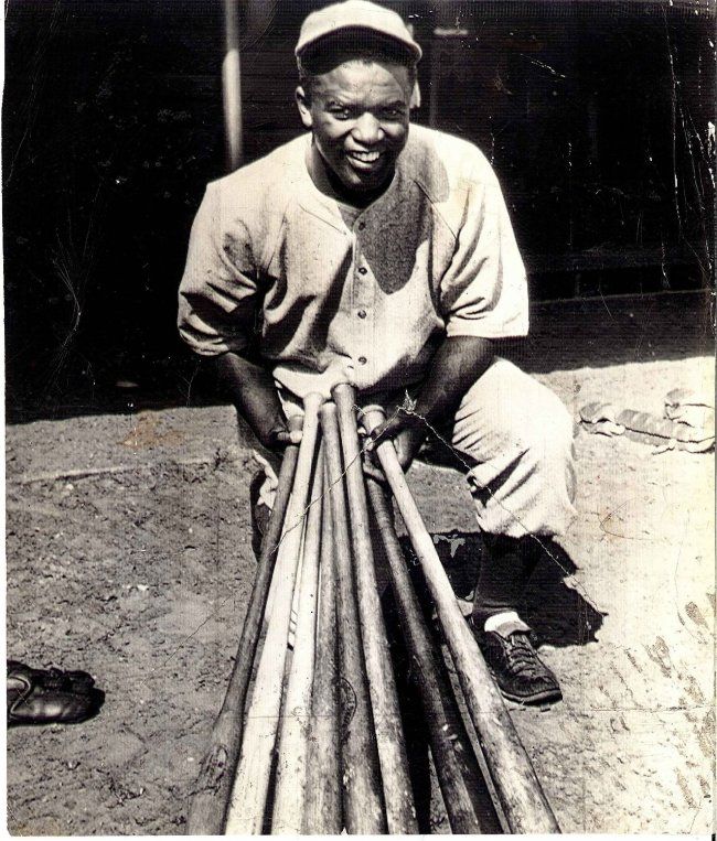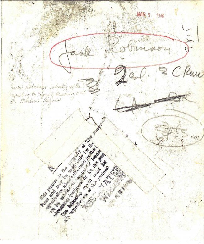 Original 1946 Type 1 photograph of Jackie Robinson holding a stack of bats. This is really a neat photograph of Robinson. This picture was taken during spring training in Montreal. This item is in fair condition, there is a tear in a triangular shape along the end of the bats. This has been repaired on the reverse. Photograph measures 7 3/8 by 8.