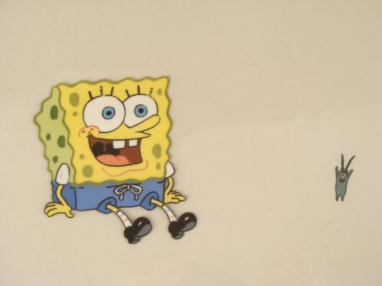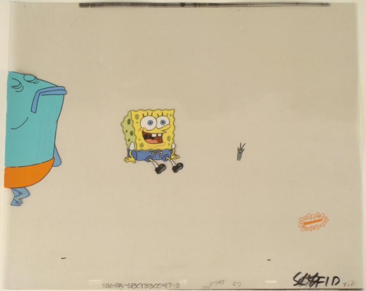 This original animation cel is from the Nickelodeon TV show SpongeBob Squarepants. The story takes place under the deep blue sea in Bikini Bottom, where SpongeBob resides. SpongeBob, who is a yellow, porous sponge, is your typical happy-go-lucky character, as he is always cheerful and enjoys making people laugh. Patrick Star, SpongeBob's neighbor who is a starfish, is your average children's show idiot, as he boasts knowing nothing and is often getting himself into ridiculous situations. Between the homes of these two lies the home of the miserable Squidward, a squid, who is known for being grouchy and playing tricks on SpongeBob and Patrick. Both SpongeBob and Squidward work at the Krusty Krab, a fast food business run by the greedy money-loving Mr. Krabs, a crab, the arch rival of the evil, possibly misunderstood, Plankton. Another neighbor, Sandy Cheeks, an athletic squirrel who normally wears an astronaut's space suit, was introduced in "Tea at the Treedome." She spends most of her time inventing and experimenting. * The cel is from the episode titled Walking Small . Victory is MINE and so is the secret recipe to the Krabby Patties. * Original Production Animated Cel Overall Size of Cel: 13 1/2" x 16 1/2" Very Good Condition This is an original hand-painted cel set-up used in the production of an episode of "SpongeBob SquarePants." Each one-of-a-kind set-up represents a slight change in position of the characters. When individually photographed and projected in rapid succession, the images appear to move. * To create production cels, the original animator's drawing is transferred onto an acetate cel (by hand-inking and/or photo copying). The cel is then hand-painted on the reverse side. * The cel is ready to be matted and framed. The animator's notations are at the bottom of the cel. There is some slight paint fade to Spongebob's and the tall blue fishes outline. There is the Nickelodeon logo located at the bottom right of the first cel. *