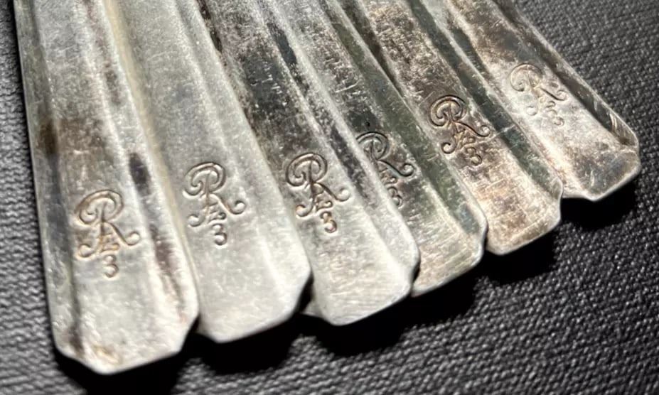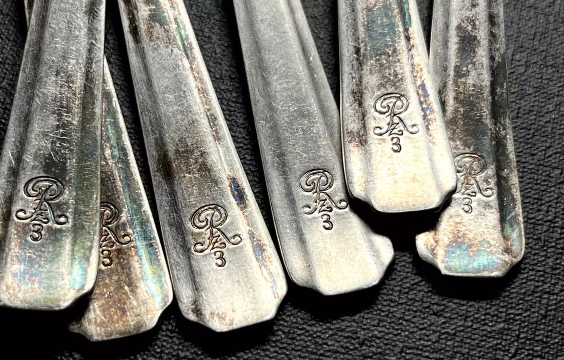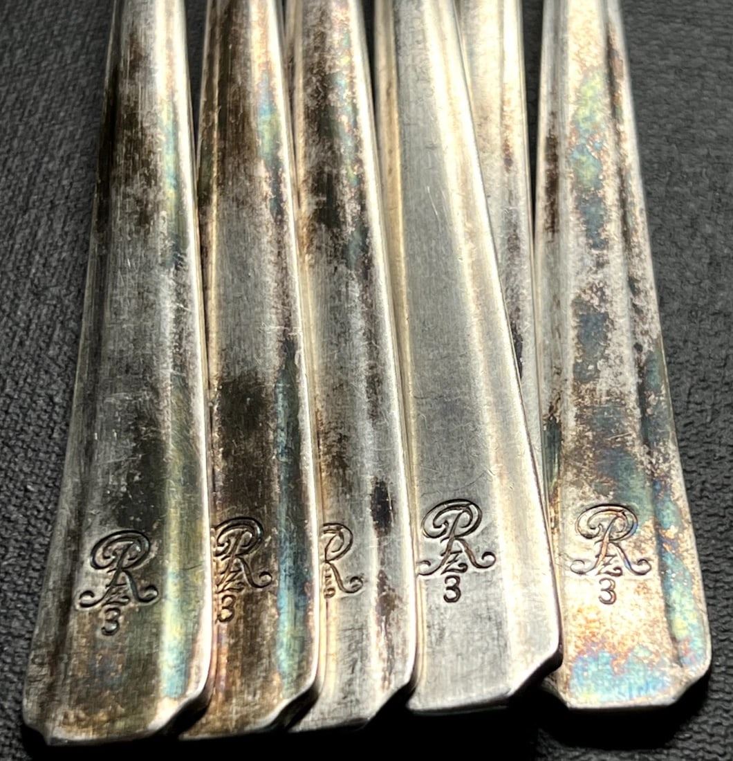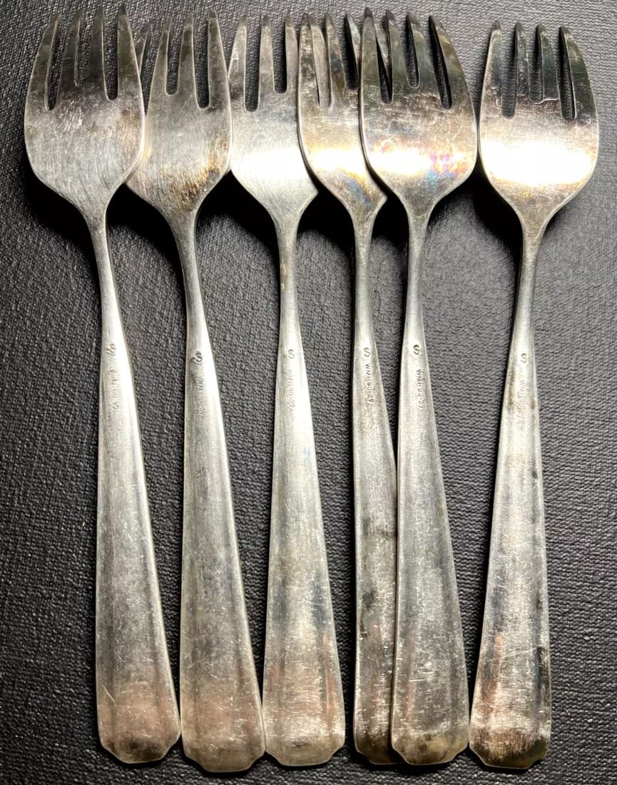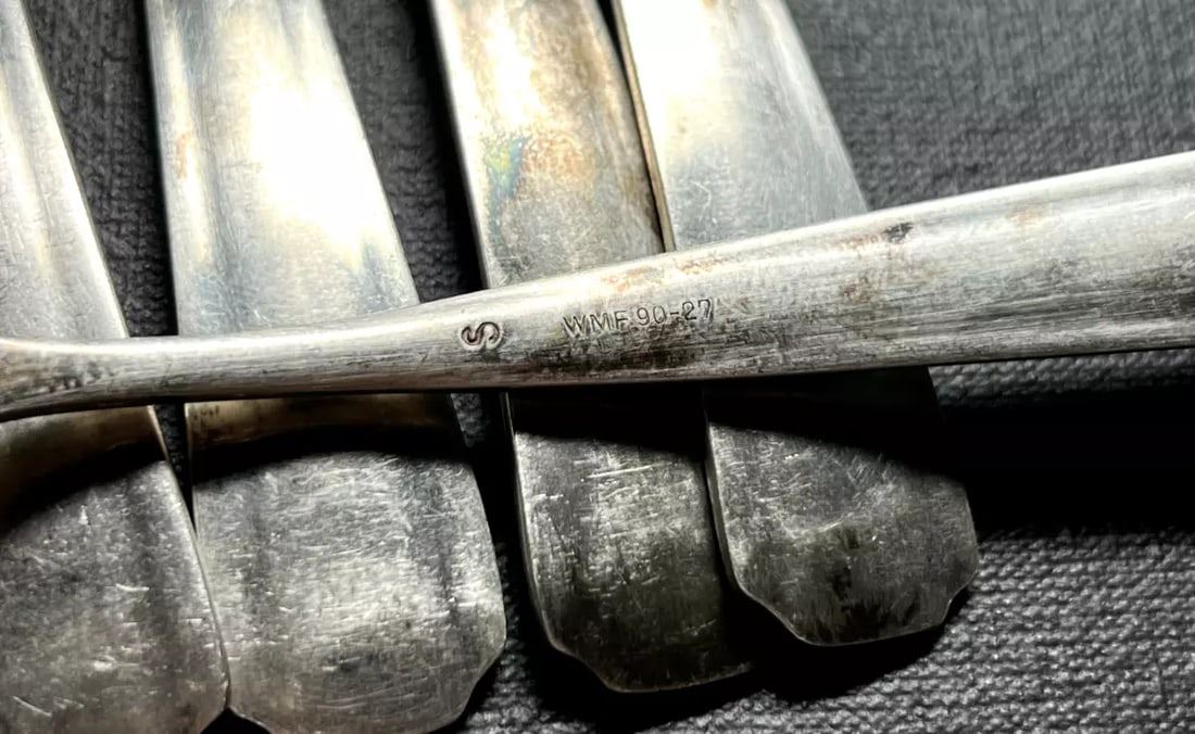 Really epic bring back, these six forks would have served the Officers of Panzer Regiment 3. The logo is nicely embossed PRZ3 the unit history shows that they were armed with the Tiger tank and were drawn into battle in Normandy in 1944 and the Ardennes in late 1944. This was a feared Panzer unit, these were bring back items from WWII. All are solid silver marked German WMF 90-27 hallmarked.