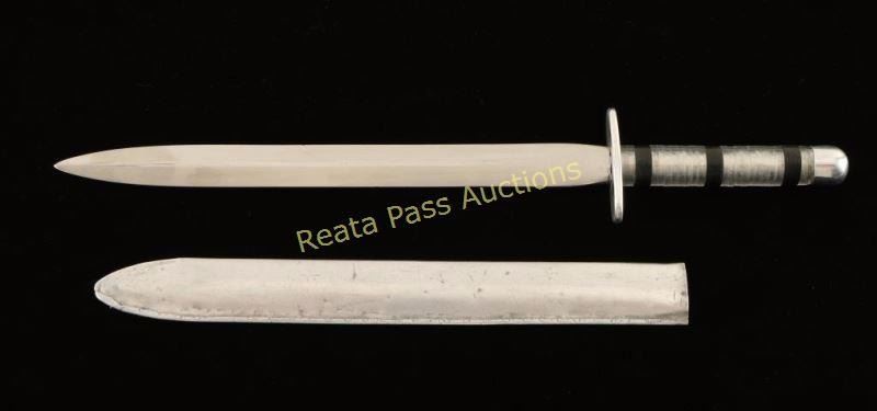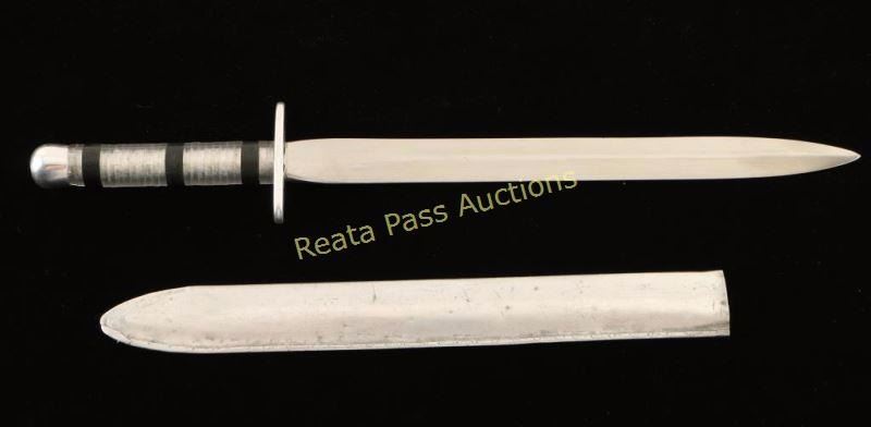 owned by our consignors grandfather James B. Whitlock US Navy, made in the Aleutian Islands in 1944, from Curtis P38 parts which is a piston engined fighter aircraft. Very interesting US historical piece. 13"overall with a 9" blade, includes metal sheath.