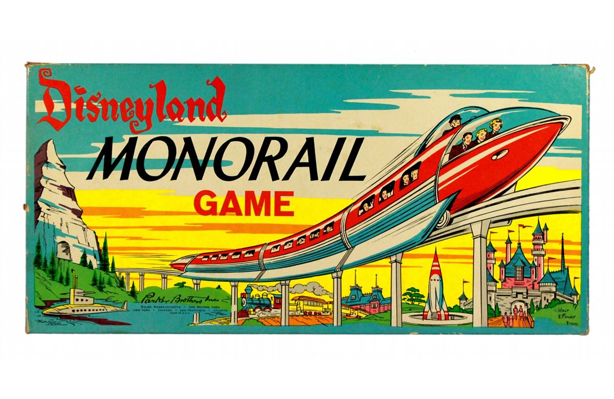 (Disneyland, 1959) Original Monorail game produced by Parker Brothers Excellent graphics throughout. The boxed game measures 8 x 16 x 1.75 in. In good condition overall with some splits in the corners of the top box.