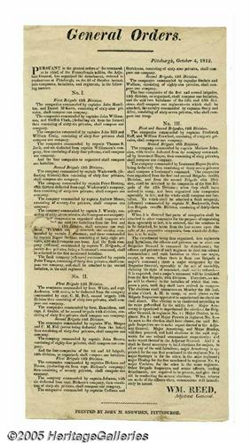 <B>Original War of 1812 General Military Orders Broadside</B></I> October 4, 1812, broadside, Pittsburgh, Pennsylvania, "General Orders." Very fine. A boldly printed large broadside, measuring 16" x 8.25". This Pennsylvania militia broadside was issued by William Reed, Adjutant General, and printed by John M. Snowden, who was a printer, bookseller, and editor of <I>The Pittsburgh Mercury.</B></I> Pursuant to the general orders of the commander in chief: <I>"of the Pennsylvania militia, the Adjutant General, has organized the detachment, ordered to rendezvous at Pittsburgh, on the 2d of October instant, into companies, battalions, and regiments, in the following manner."</B></I> Details follow concerning the organization of the troops. Trivial old tape repair on the blank verso, two small central repairs at left affecting a few words, otherwise quite impressive. Attractive and ready for framing and display. Lot:253