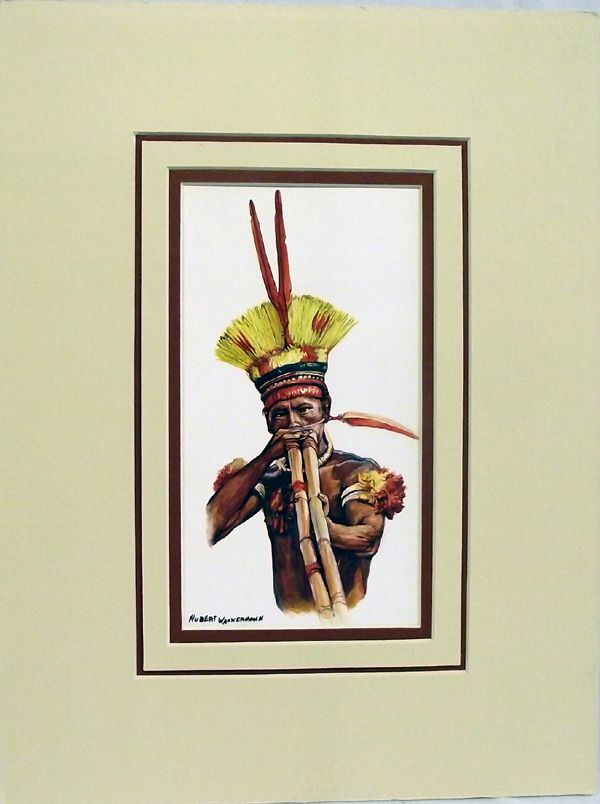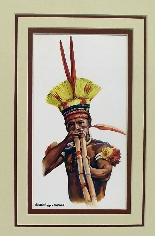 Original Watercolor by listed artist Hubert Wackermann, measures 7 5/8'' x 4.5'', nicely matted, signed in lower left hand corner, depicts indigenous man of South America Rain Forest Tribes blowing dart gun wearing colorful headdress indicative of rain forest tribes, though born and educated in West Germany, Hubert Wackermann depicts his favorite subject matter: the North American Indian, his natural surroundings, and relevant wild life. Mr. Wackermann's depiction of the Native Americans is the result of an intimate knowledge of his subject matter through travel, study and living with different tribes through the years.