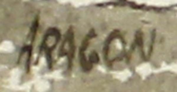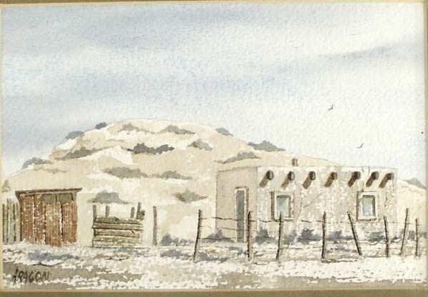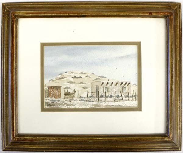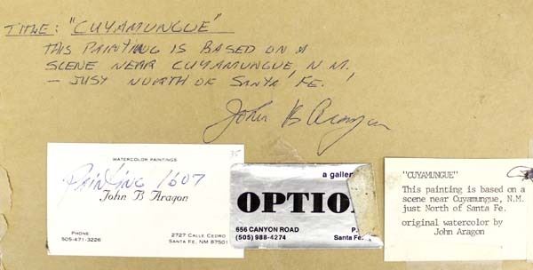 Original Watercolor Painting ''Cuyamungue'' by John B. Aragon, provenance on back, framed, double matted, and under glass, visual measures 4'' x 6'' and is signed on both the front and back, FYI: ''This painting is based on a scene near Cuyamungue, N.M. just North of Santa Fe.''