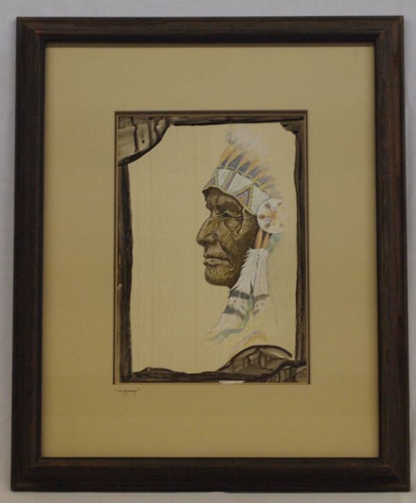 From the Tucson, Arizona Collection. Original Watercolor ''The Headman'' by New Mexico Artist Carl Newman, Jr, visual measures 9'' x 12.5'', signed in lower left corner by artist, double matted, framed, and under glass, artist found in AskArt, Artist Bio: New Mexico Artist known for his Native American portraits, and figure painting, works in multi-media