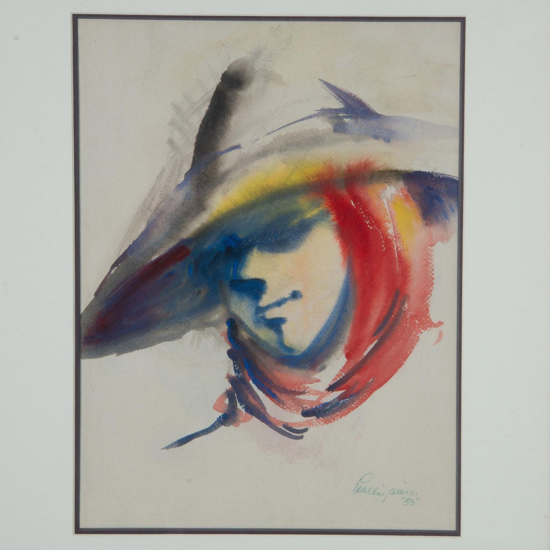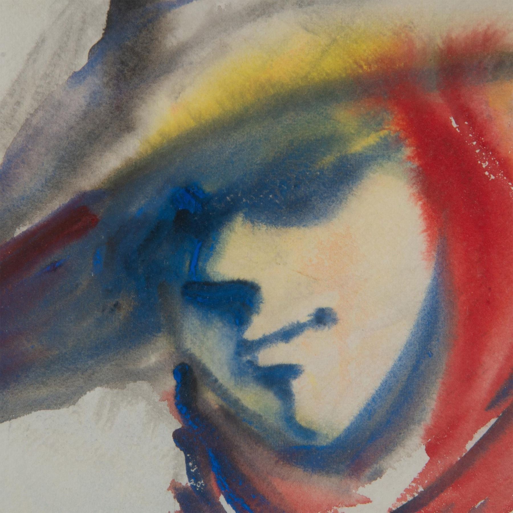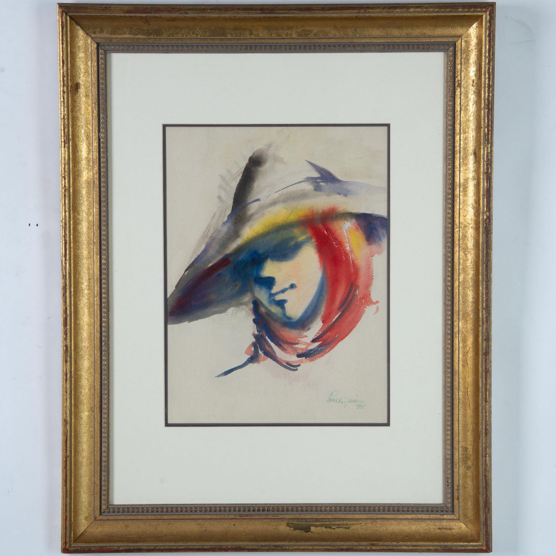 Original watercolor and wax crayons on laid paper of a woman with a wide brim hat and wraparound scarf that the artist painted with primary colors. Signature and date in green on lower right: Illegible 55. Housed in a gilded frame with an off-white mat. Sticker on verso: Fred Reed Picture Framing Inc, Atlanta, Ga. Artwork dimensions: 11.50"L x 15.50"H. Frame size: 22.50"L x 28.50"H x 2"W. Artwork can be unframed and rolled for shipment.