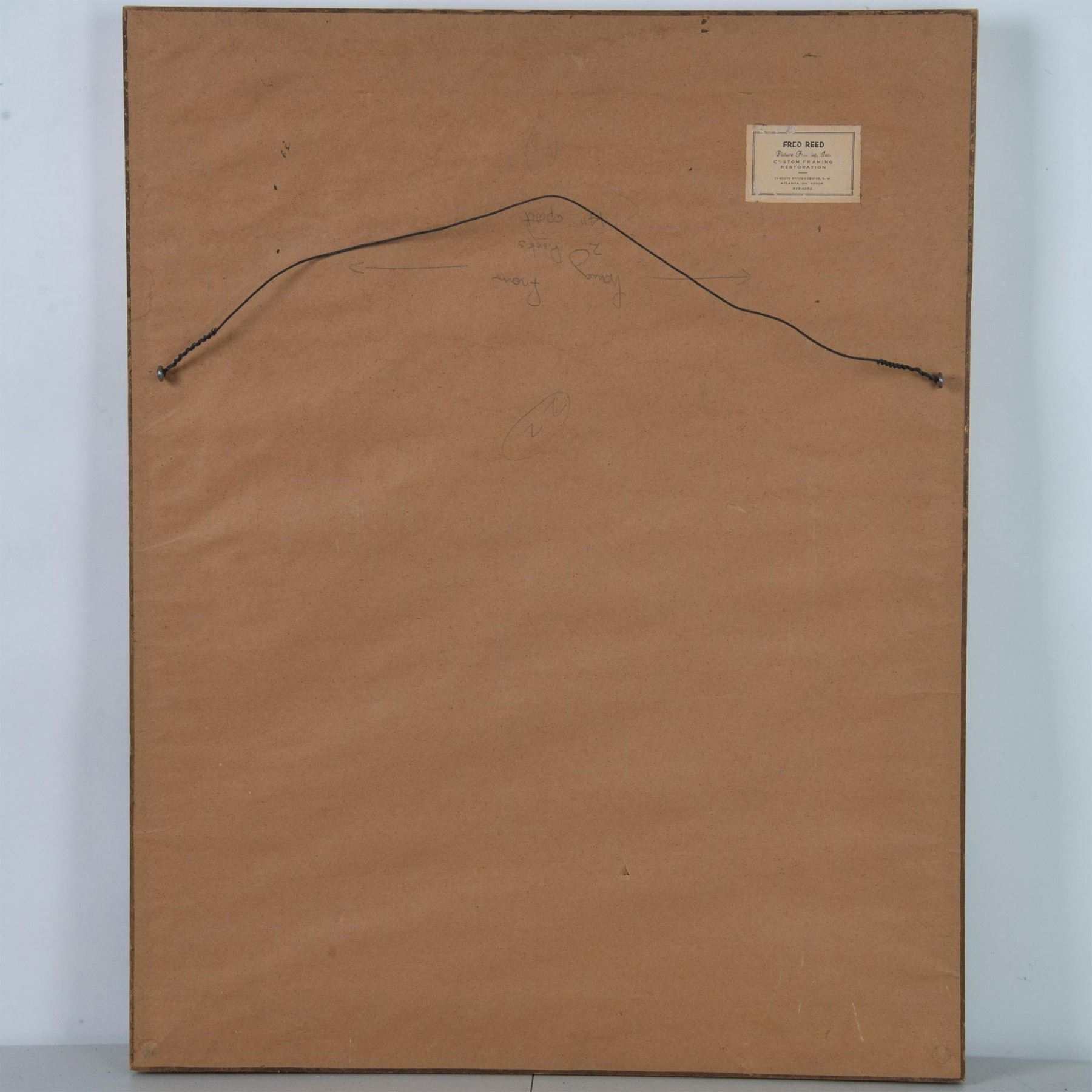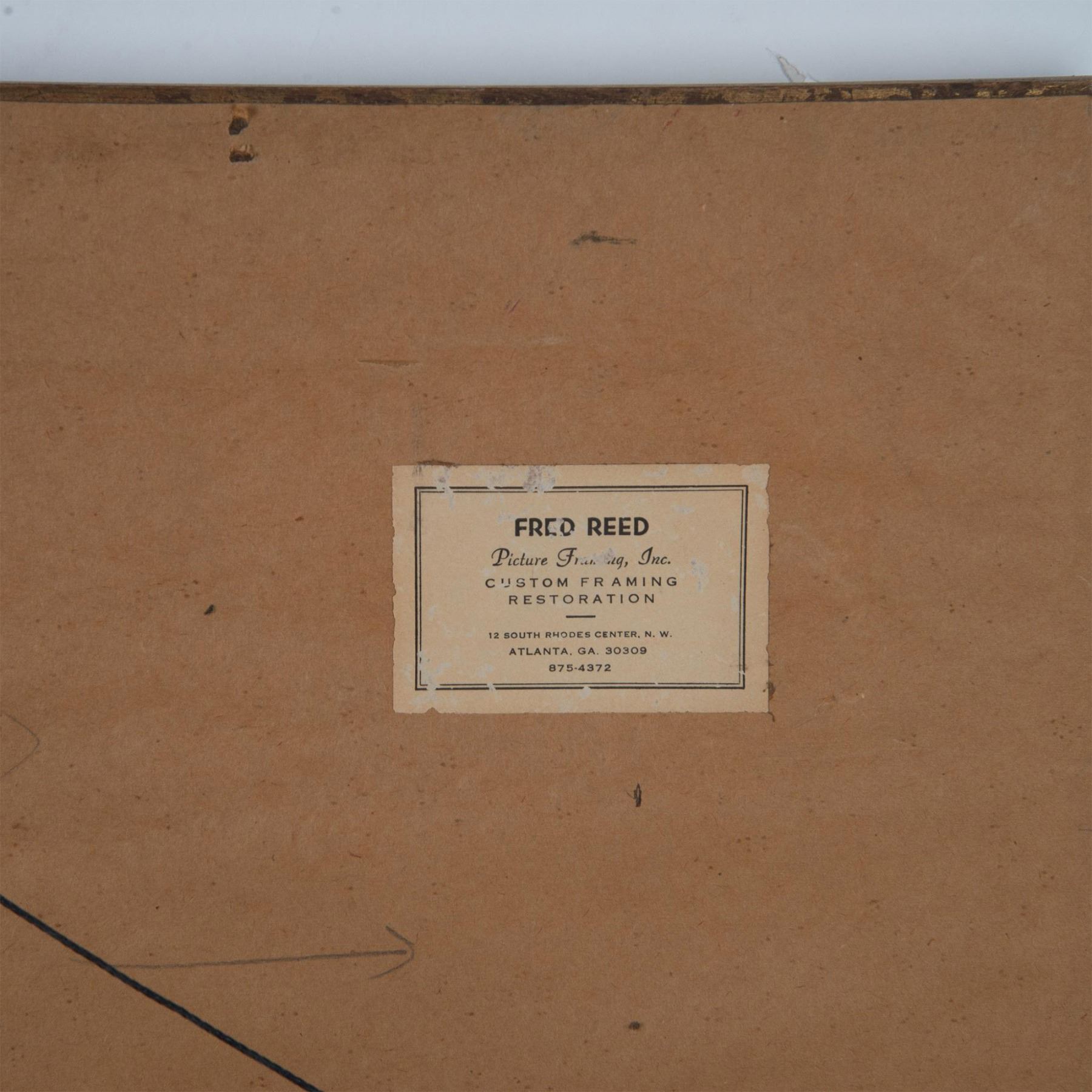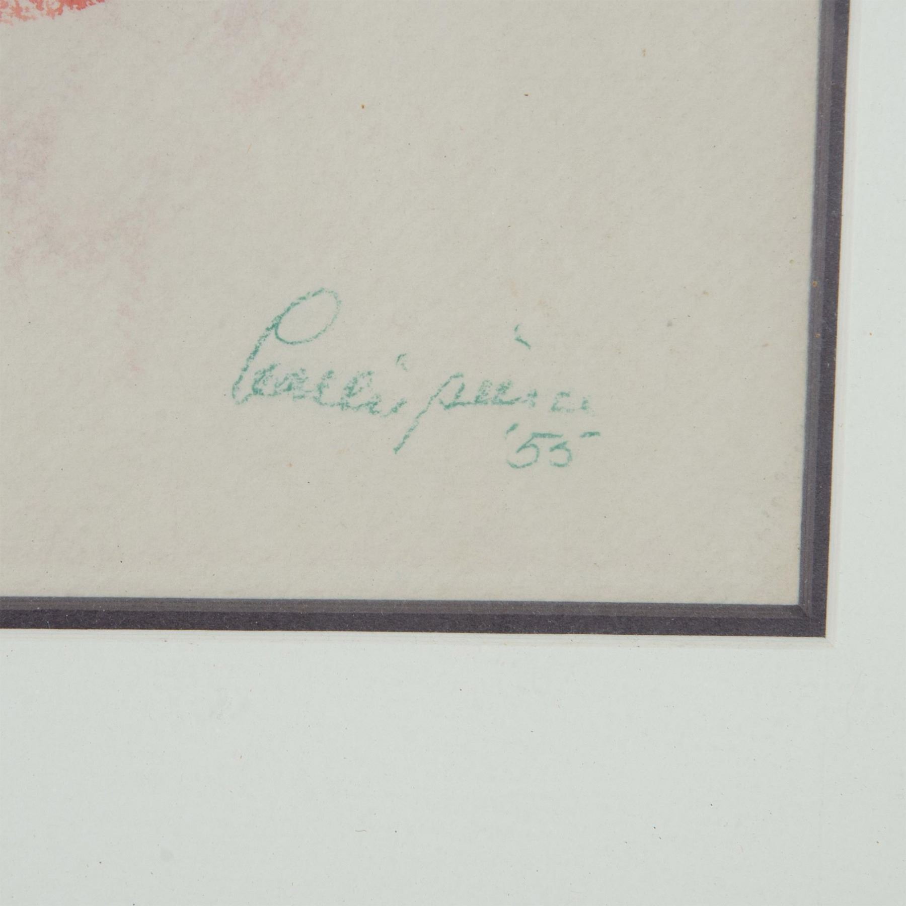 Original watercolor and wax crayons on laid paper of a woman with a wide brim hat and wraparound scarf that the artist painted with primary colors. Signature and date in green on lower right: Illegible 55. Housed in a gilded frame with an off-white mat. Sticker on verso: Fred Reed Picture Framing Inc, Atlanta, Ga. Artwork dimensions: 11.50"L x 15.50"H. Frame size: 22.50"L x 28.50"H x 2"W. Artwork can be unframed and rolled for shipment.